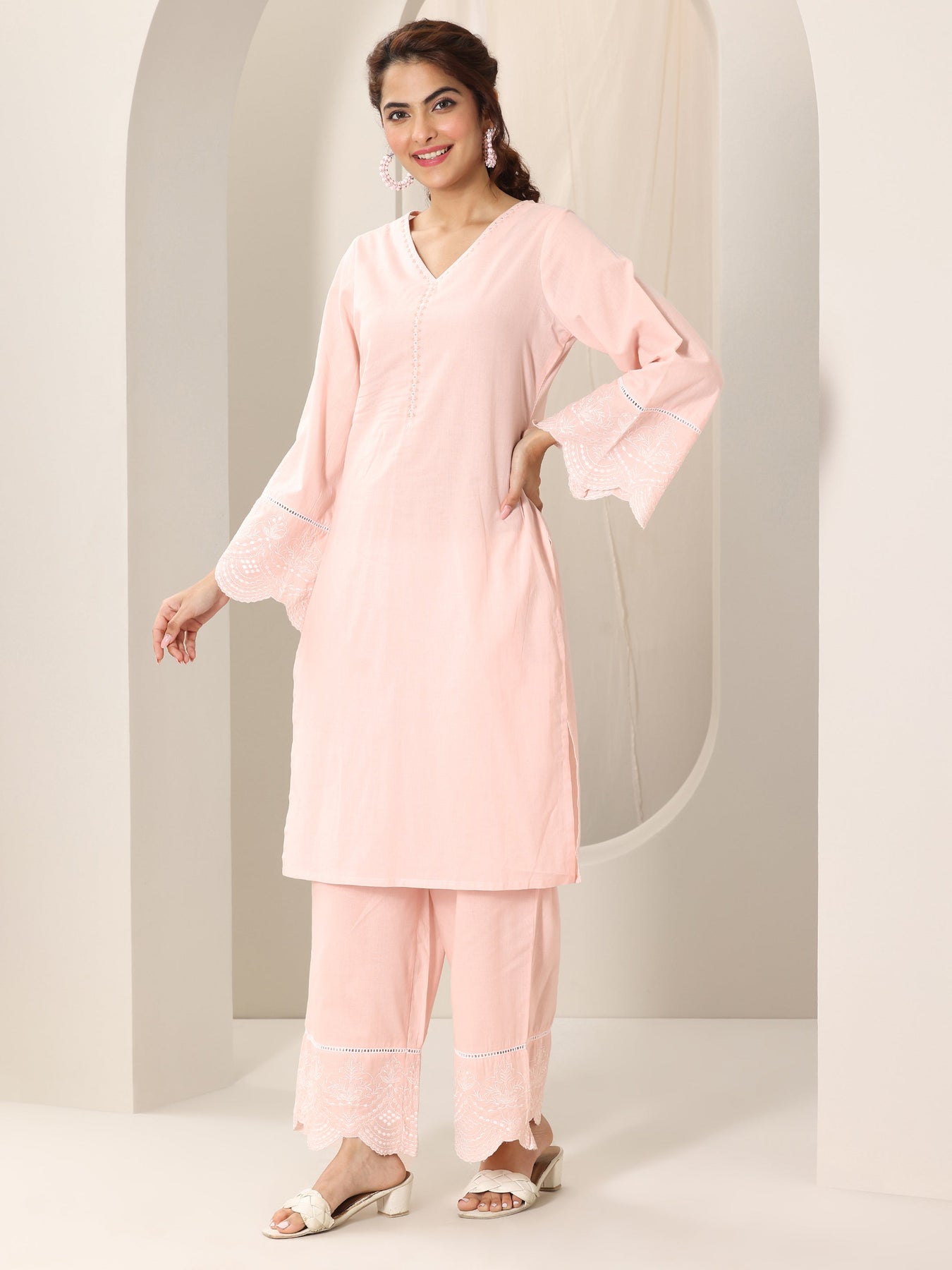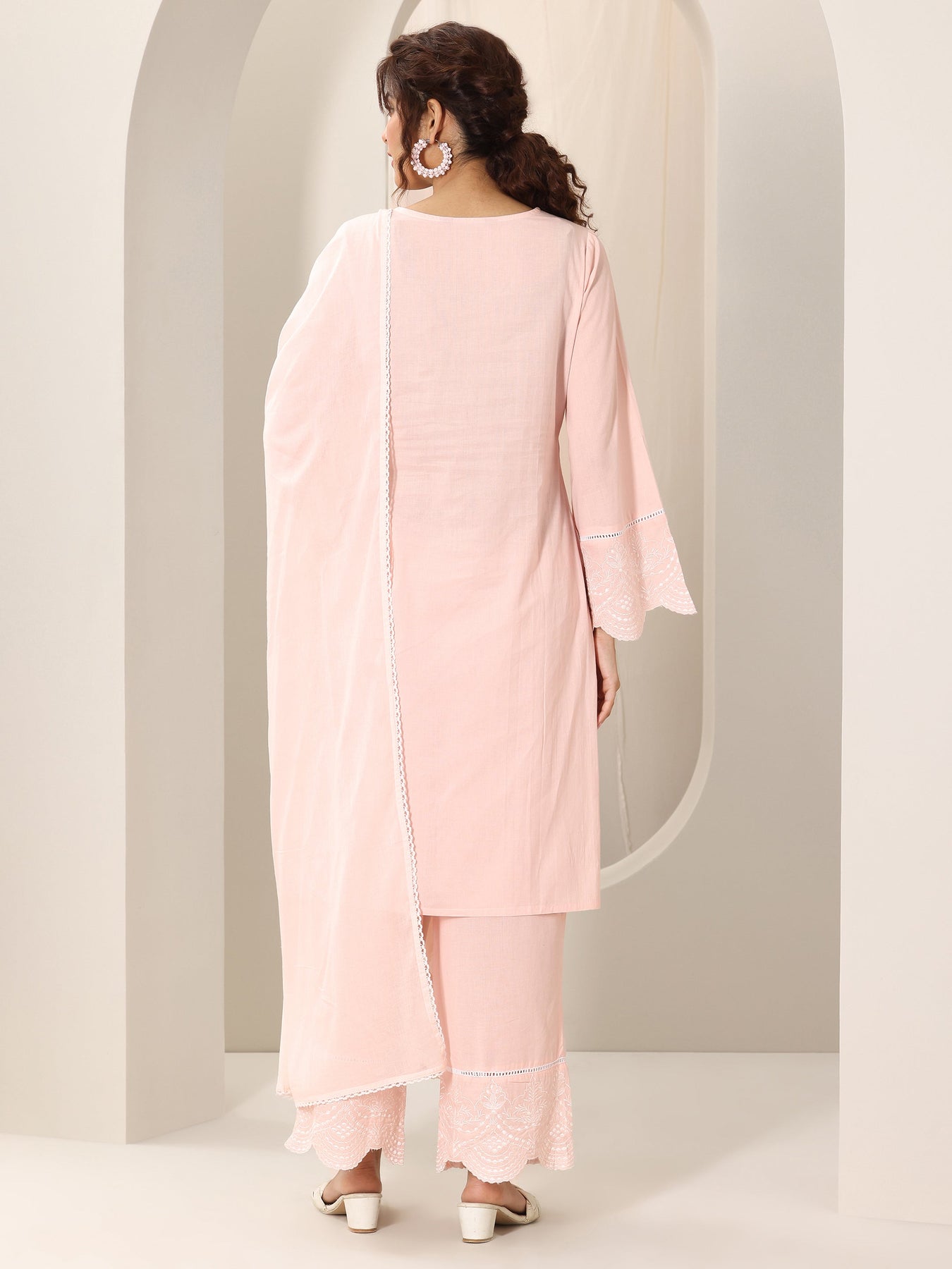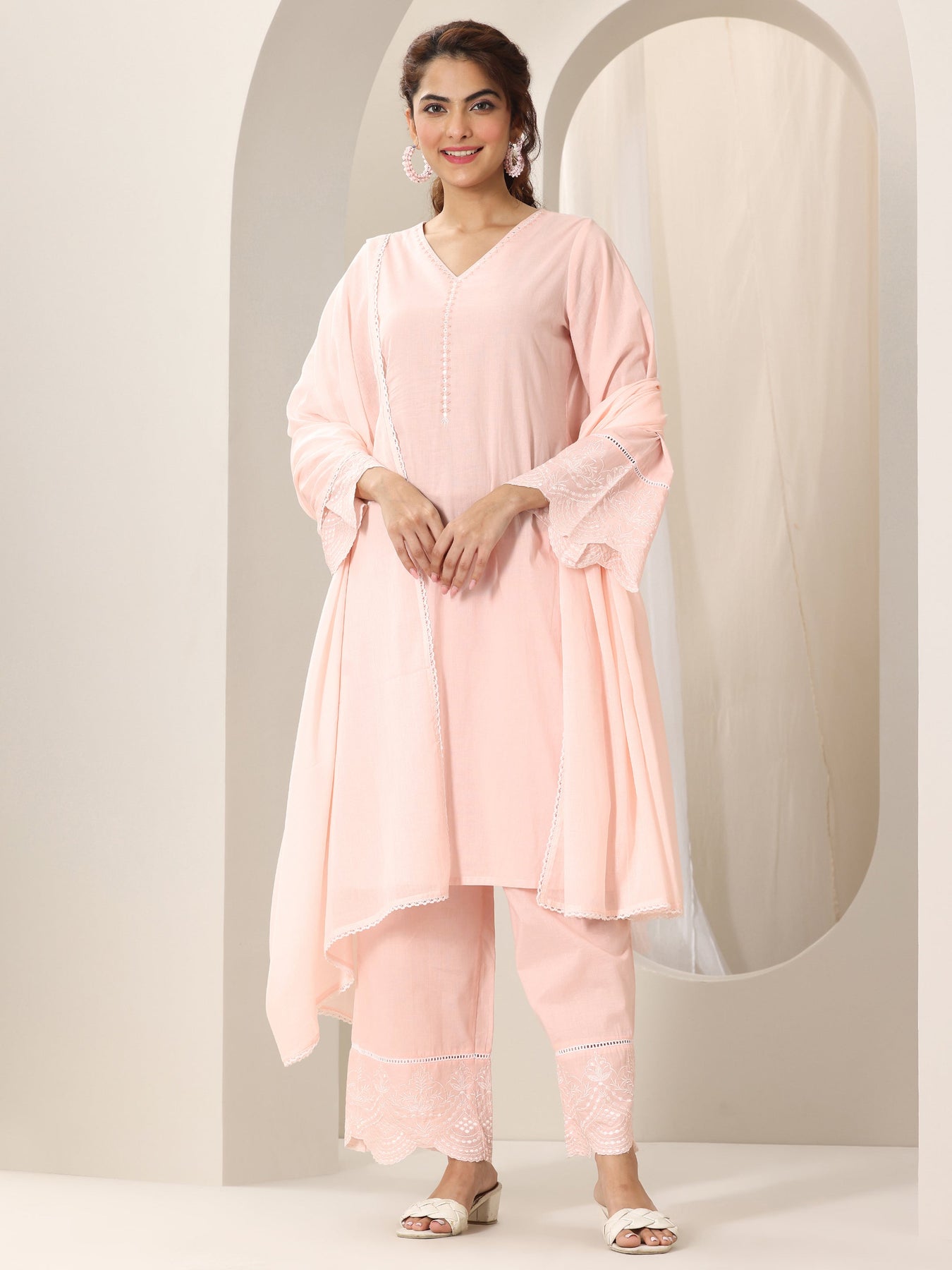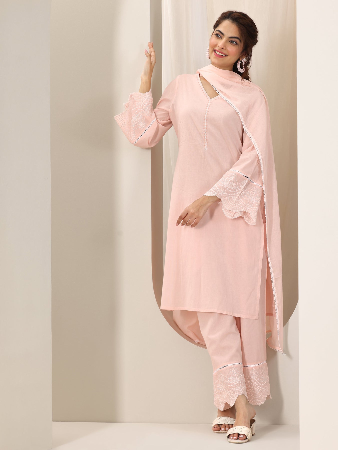 Our 3-piece peach pure cotton kurta set features a straight-fit kurta with a keyhole neckline, bell sleeves, and a statement yoke. Complemented with straight pants with an elasticated waistband and a solid dupatta. Adorned with solid accents, this style is perfect for casual occasions.