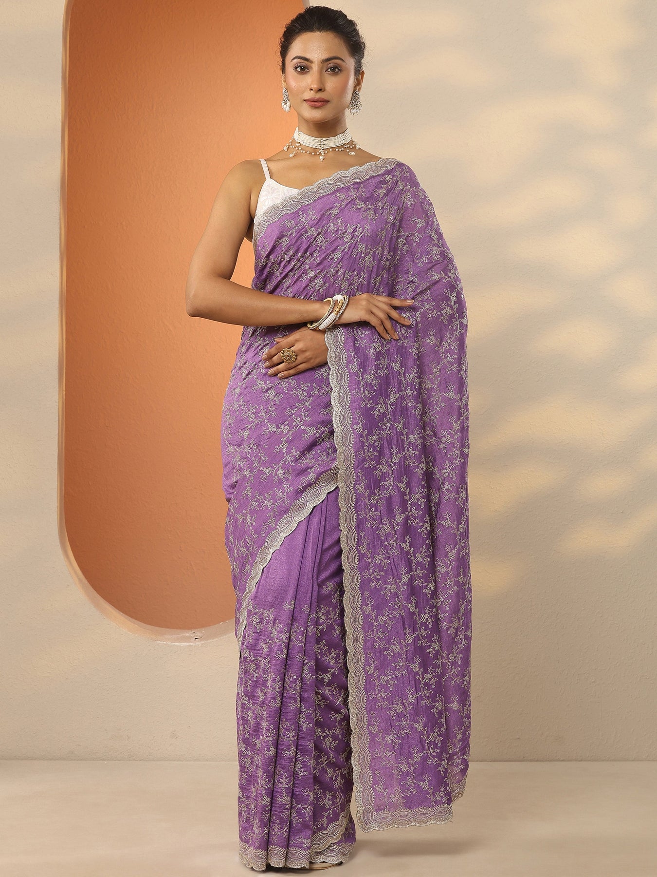 Our Purple Embroidered Silk Blend Saree. Complemented With An Unstitched Blouse Piece. This Charming Saree Is Perfect For Festive Occasions.