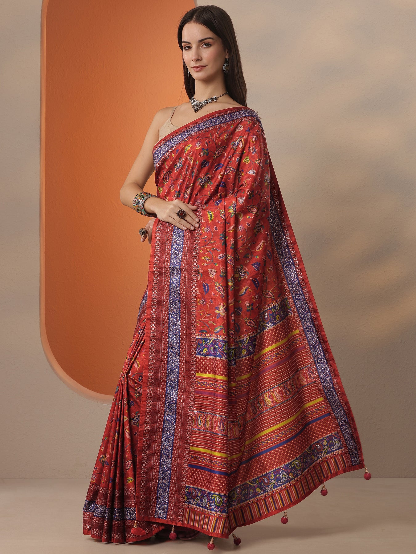 Red Printed Silk Blend Saree With Unstitched Blouse Piece