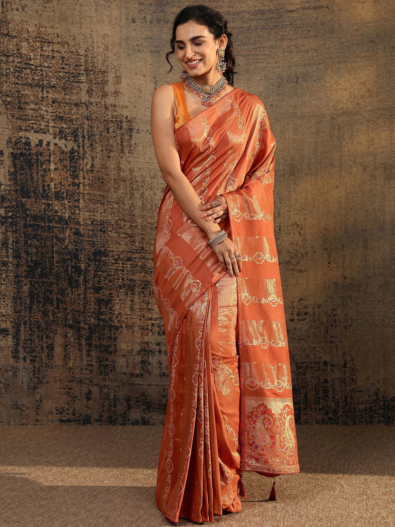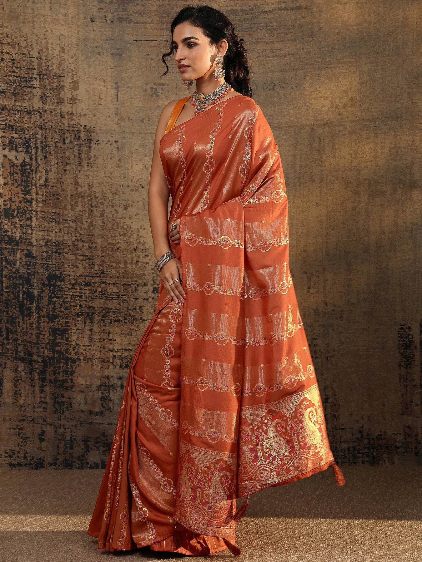 Rust Woven Design Silk Blend Saree With Unstitched Blouse Piece