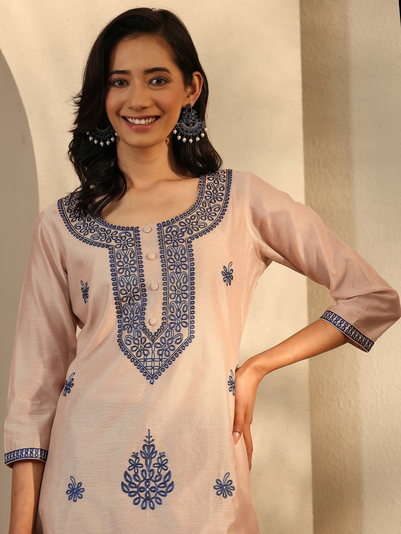 Beige Embroidered Chanderi Silk Straight Kurta