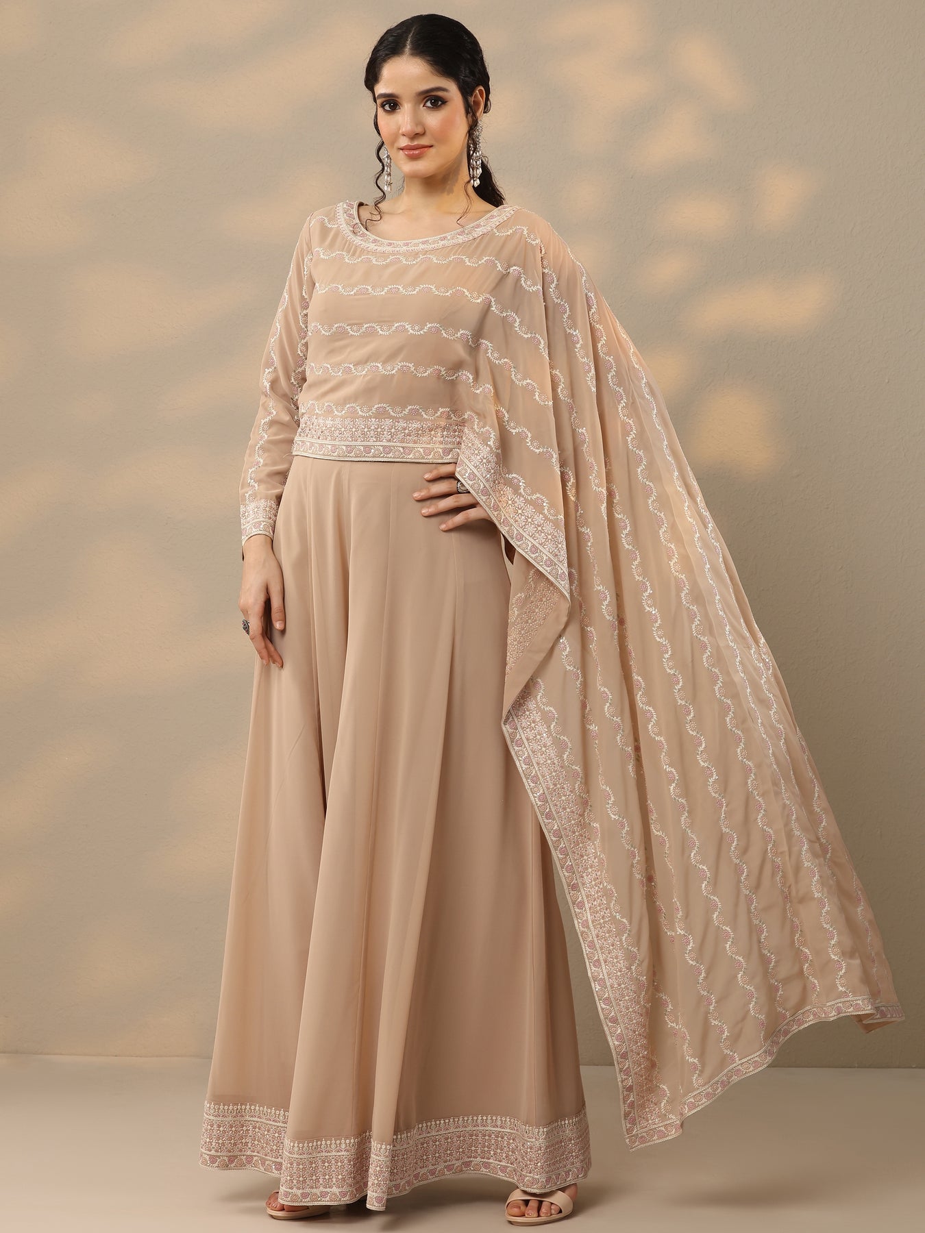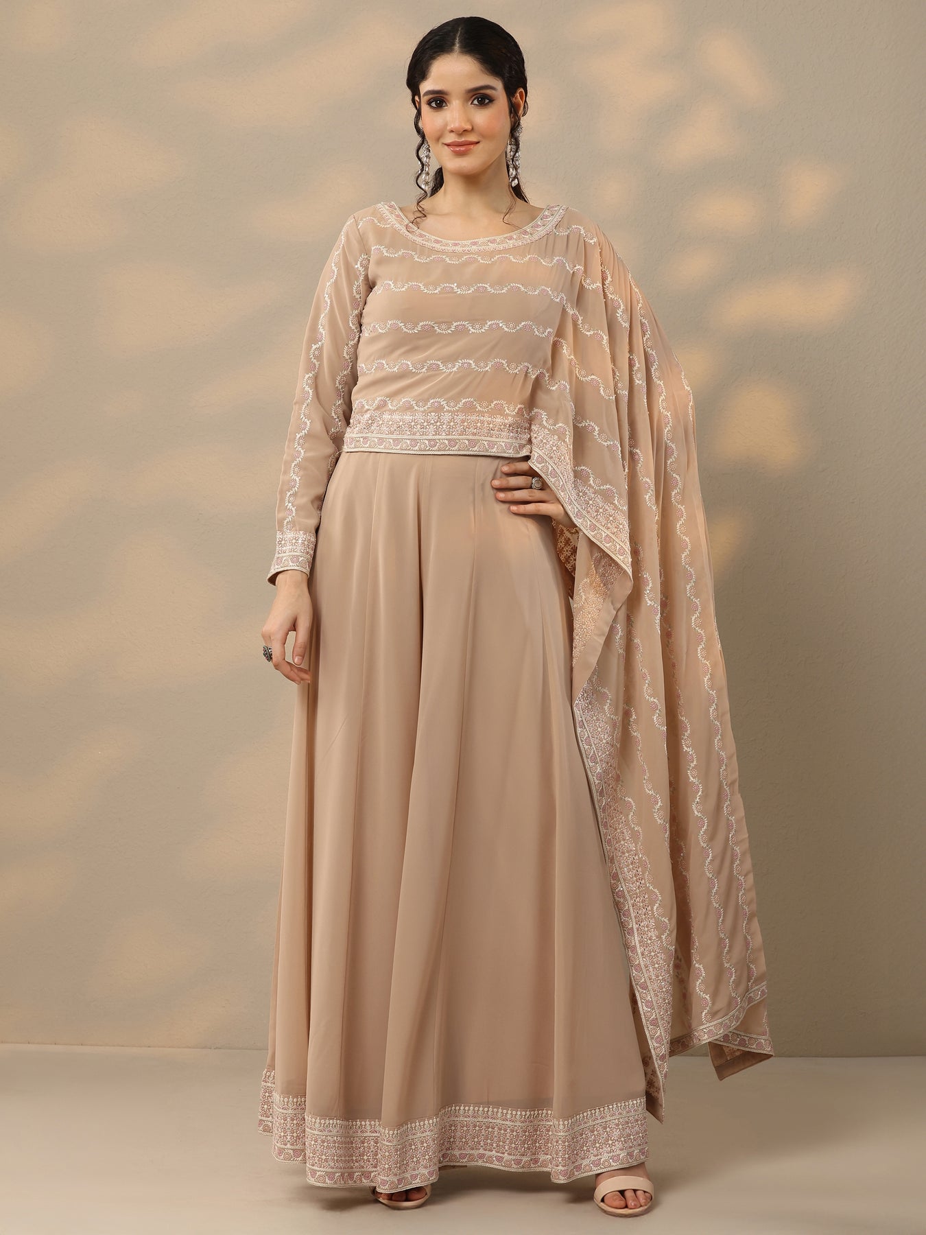 Our 2-piece beige embroidered poly georgette co-ord set features a stylish crop top with a round neckline and a cape sleeve. Complemented with palazzo pants with a partially elasticated waistband. This charming style is adorned with embroidery and sequins making it perfect for festive celebrations.