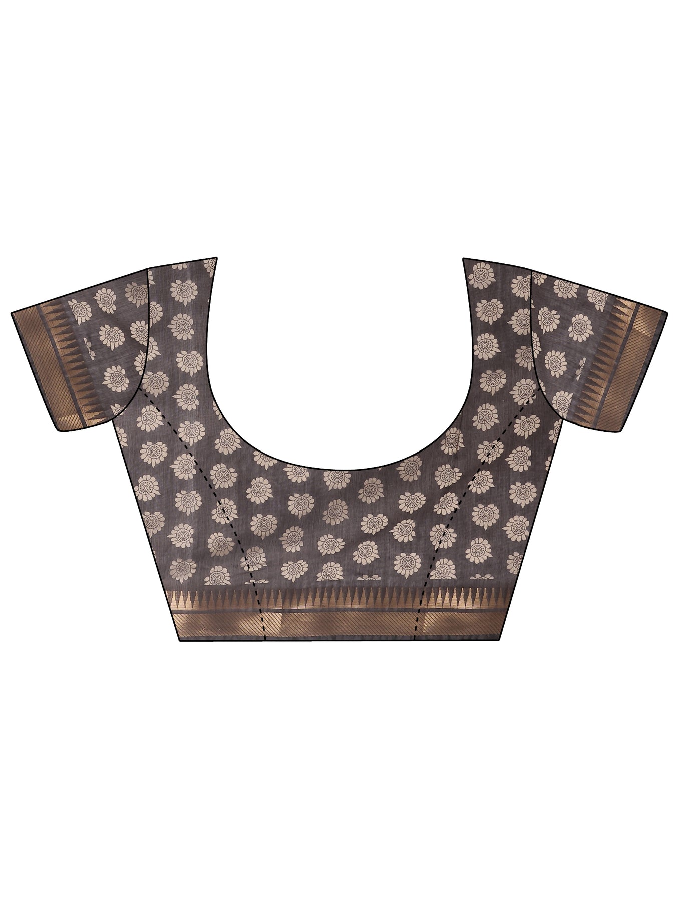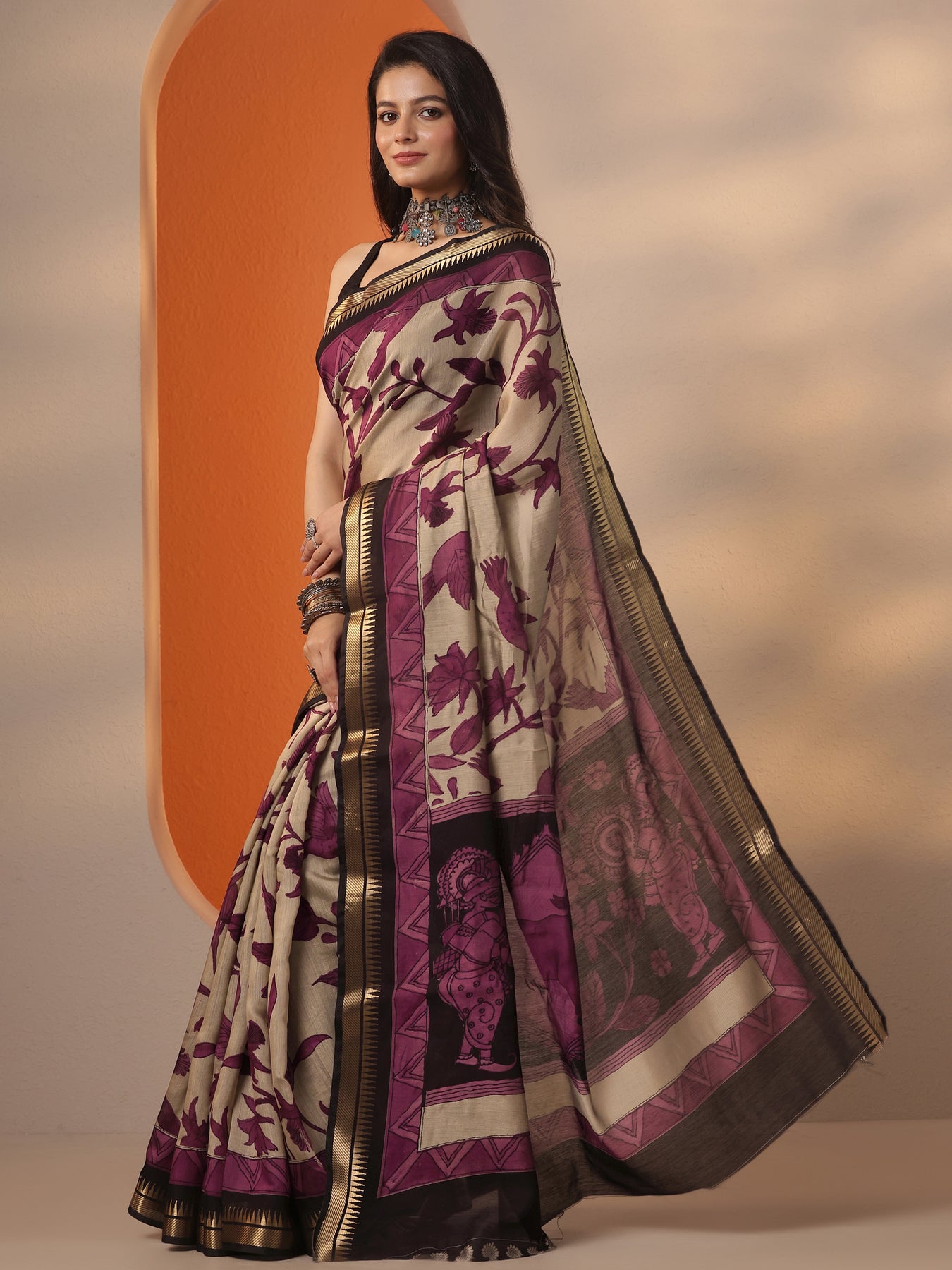 Beige Printed Silk Blend Saree With Unstitched Blouse Piece