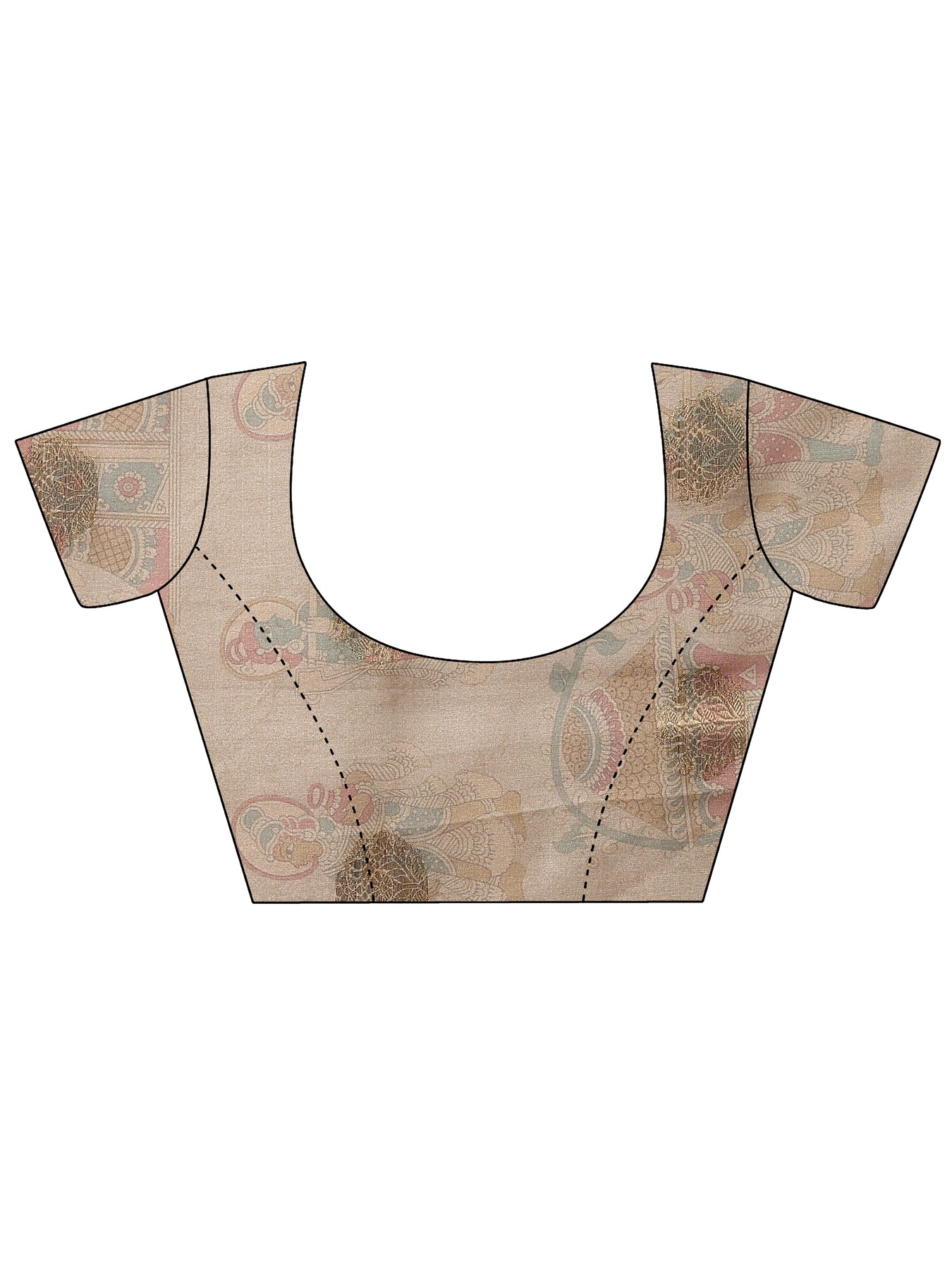 Beige Printed Silk Blend Saree With Unstitched Blouse Piece