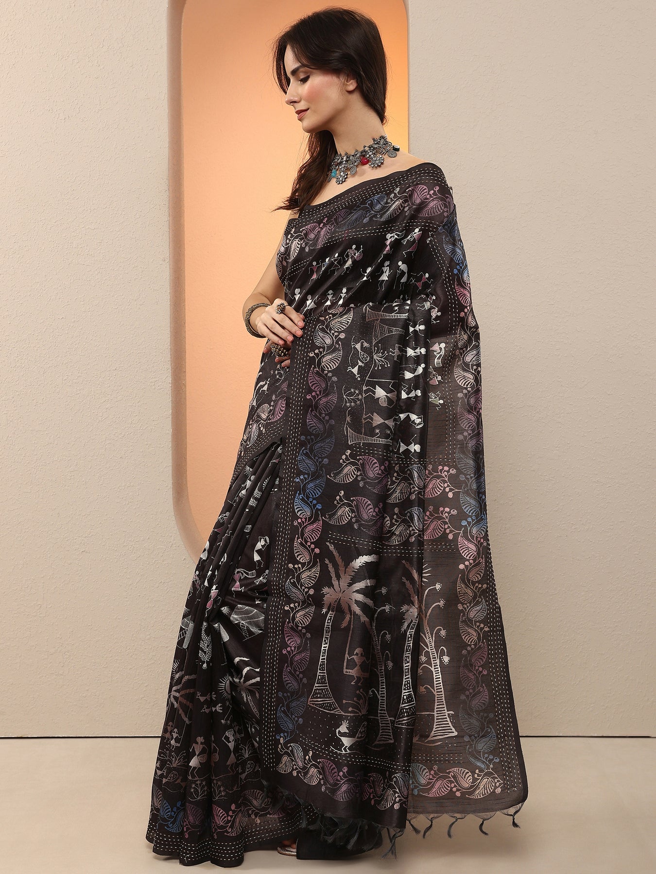 Black Kalamkari Printed Silk Blend Saree With Unstitched Blouse Piece
