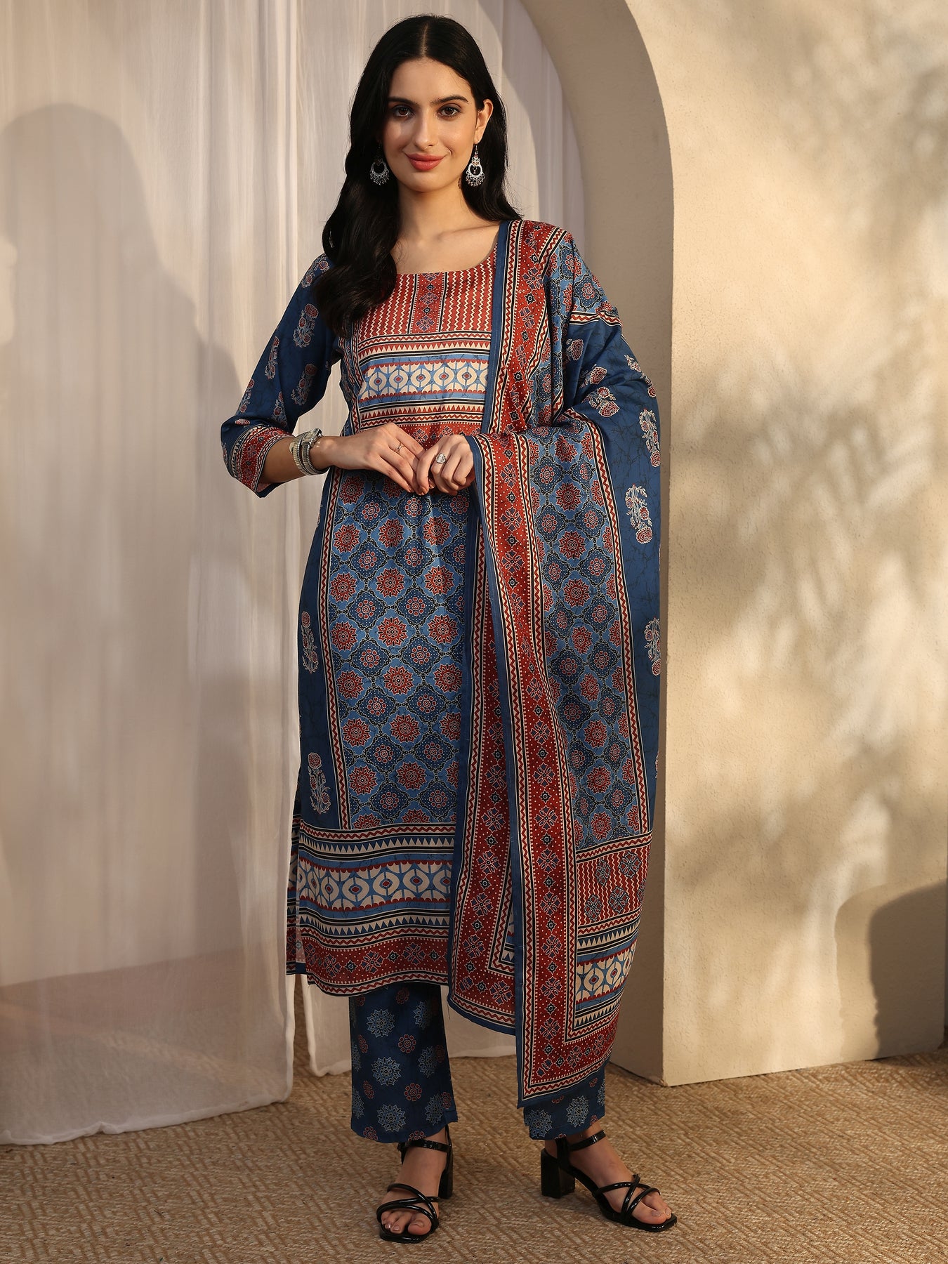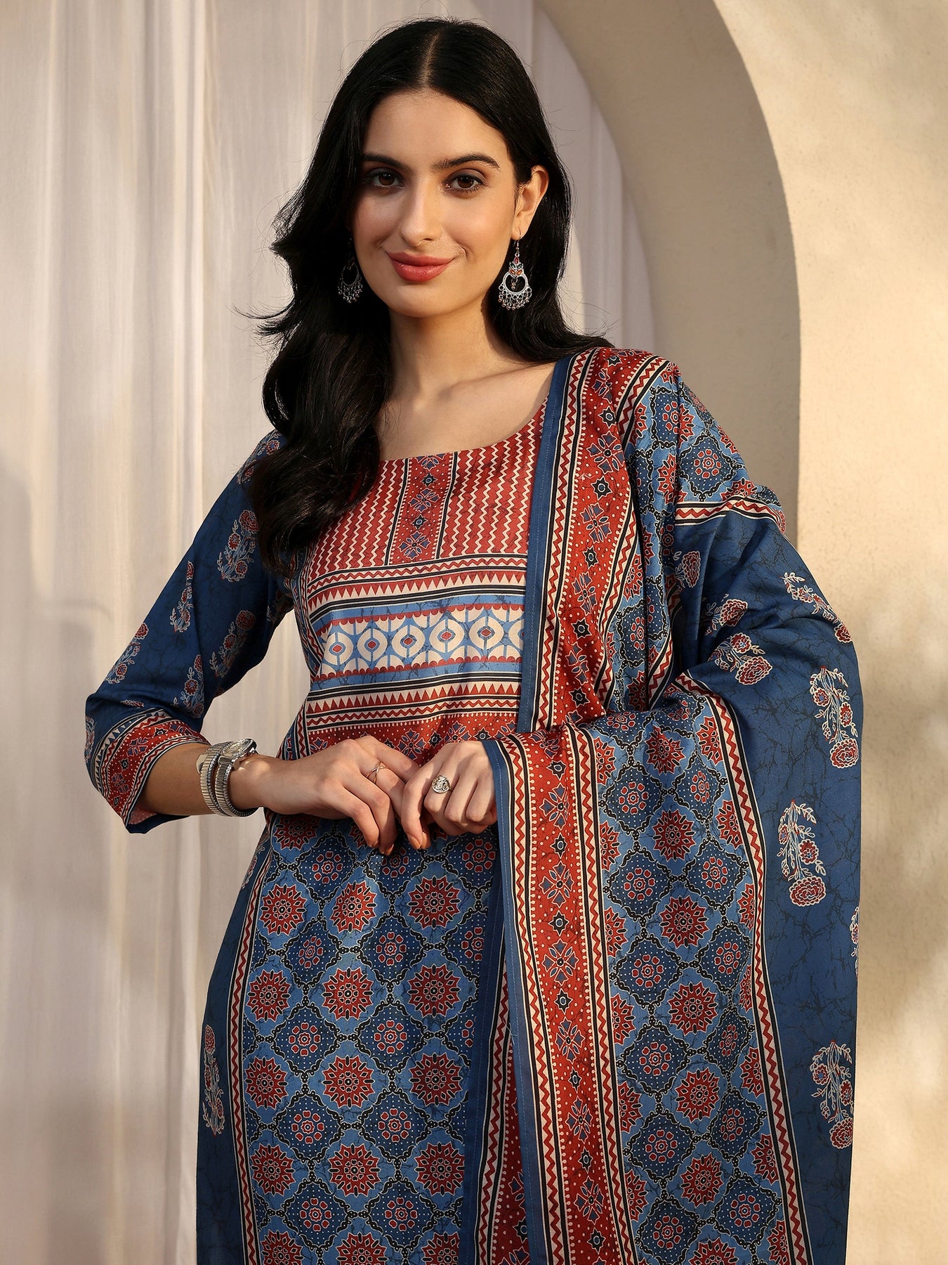 Our 3-piece blue and red cotton blend straight-fit kurta set features a round neckline, regular sleeves, and statement yoke. Complemented with straight pants with a partially elasticated waistband and 2 pockets, and a printed dupatta. Adorned with ethnic motif printed, this style is perfect for work wear and casual wear.