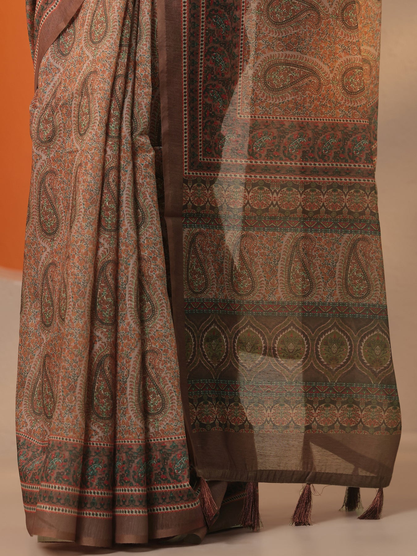 Brown Printed Silk Blend Saree With Unstitched Blouse Piece