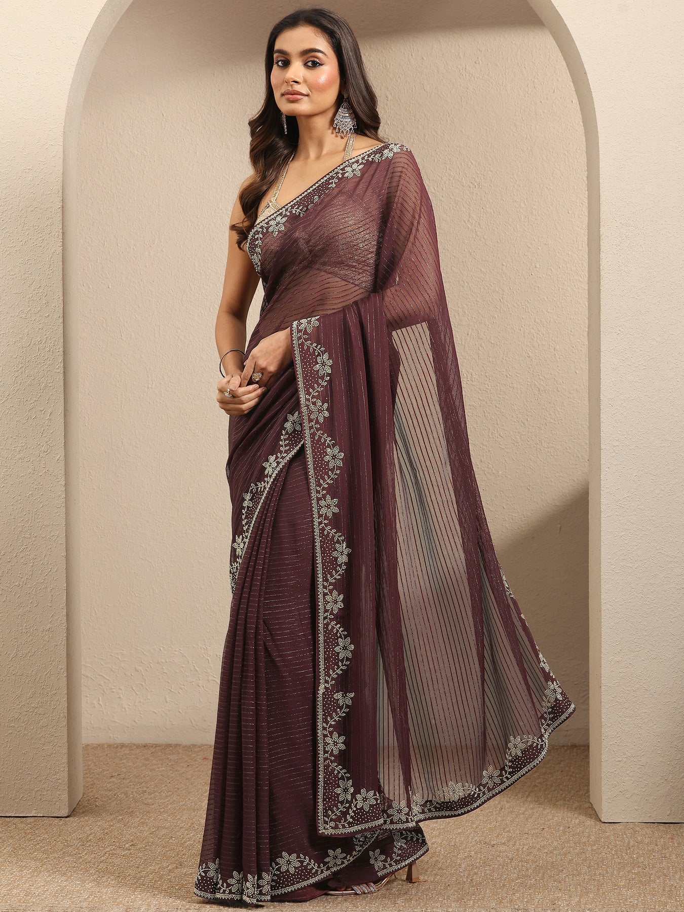 Burgundy Embellished Georgette Saree With Unstitched Blouse Piece