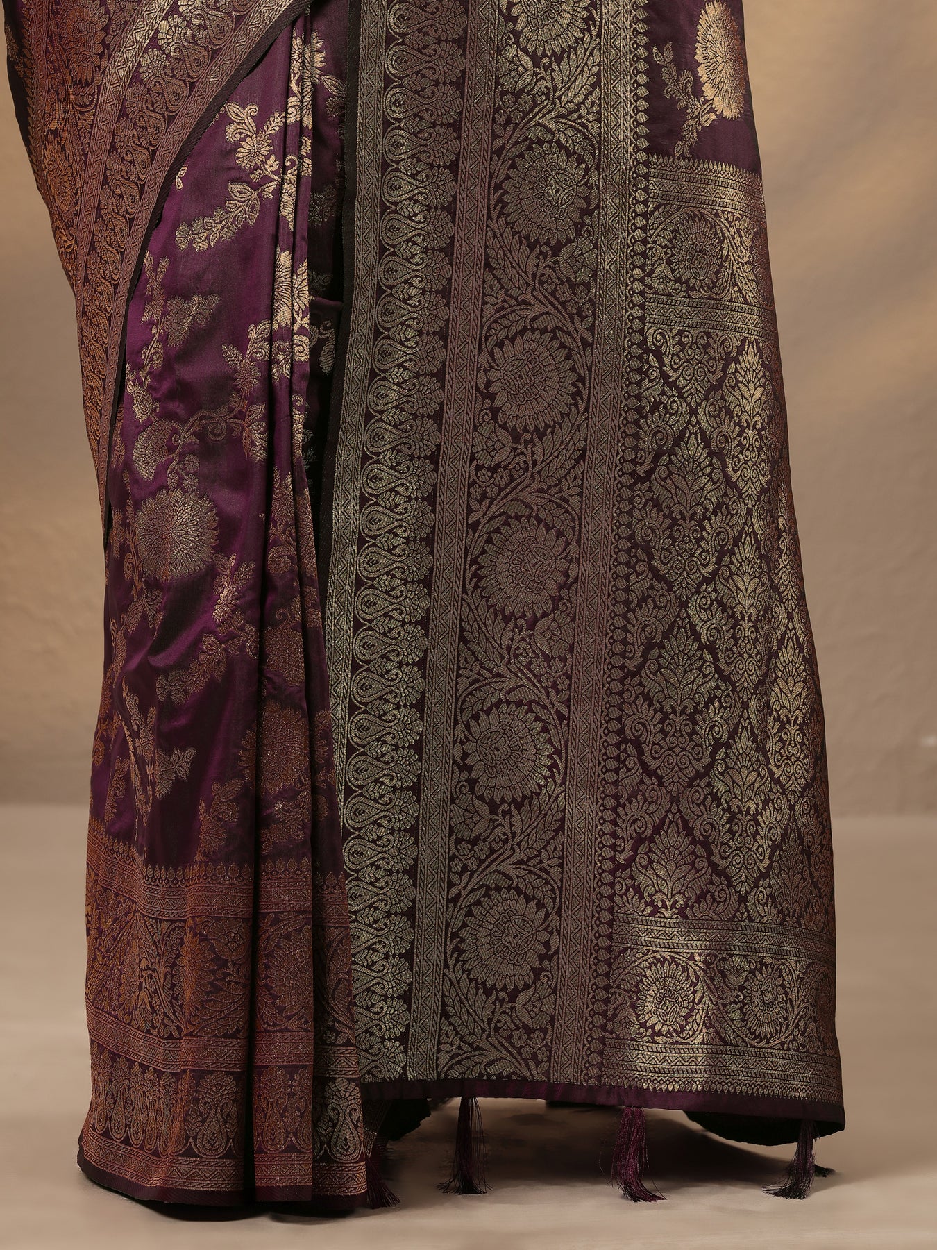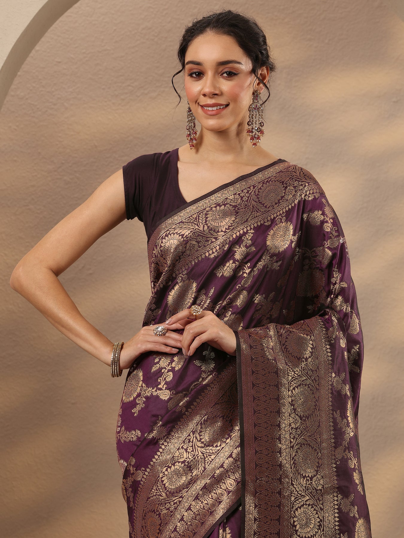 Our Burgundy Woven Design Silk Blend Saree Features Captivating Floral. Complemented With An Unstitched Blouse Piece. This Charming Saree Is Perfect For Festive Occasions.