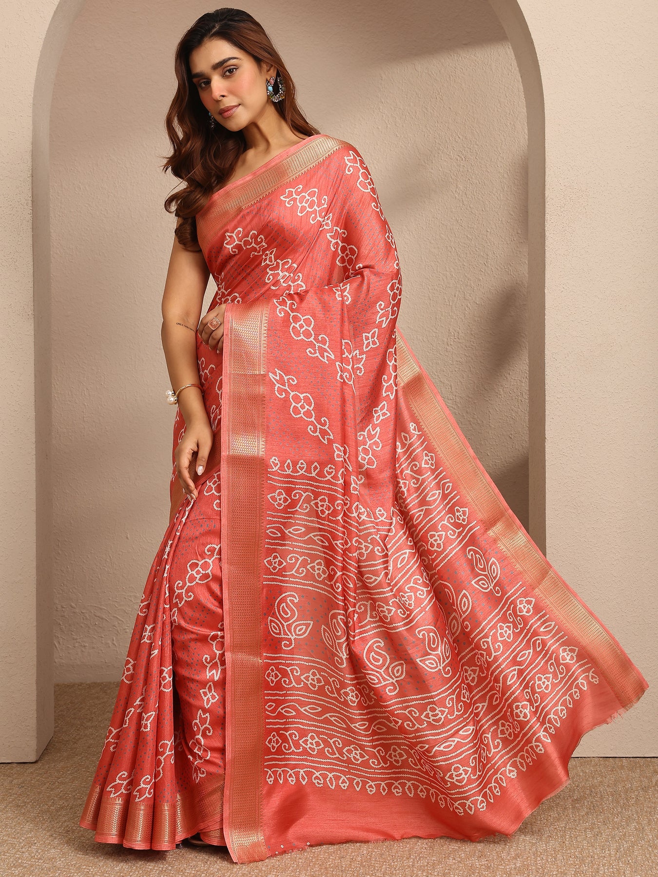 Coral Bandhani Printed Silk Blend Saree With Unstitched Blouse Piece
