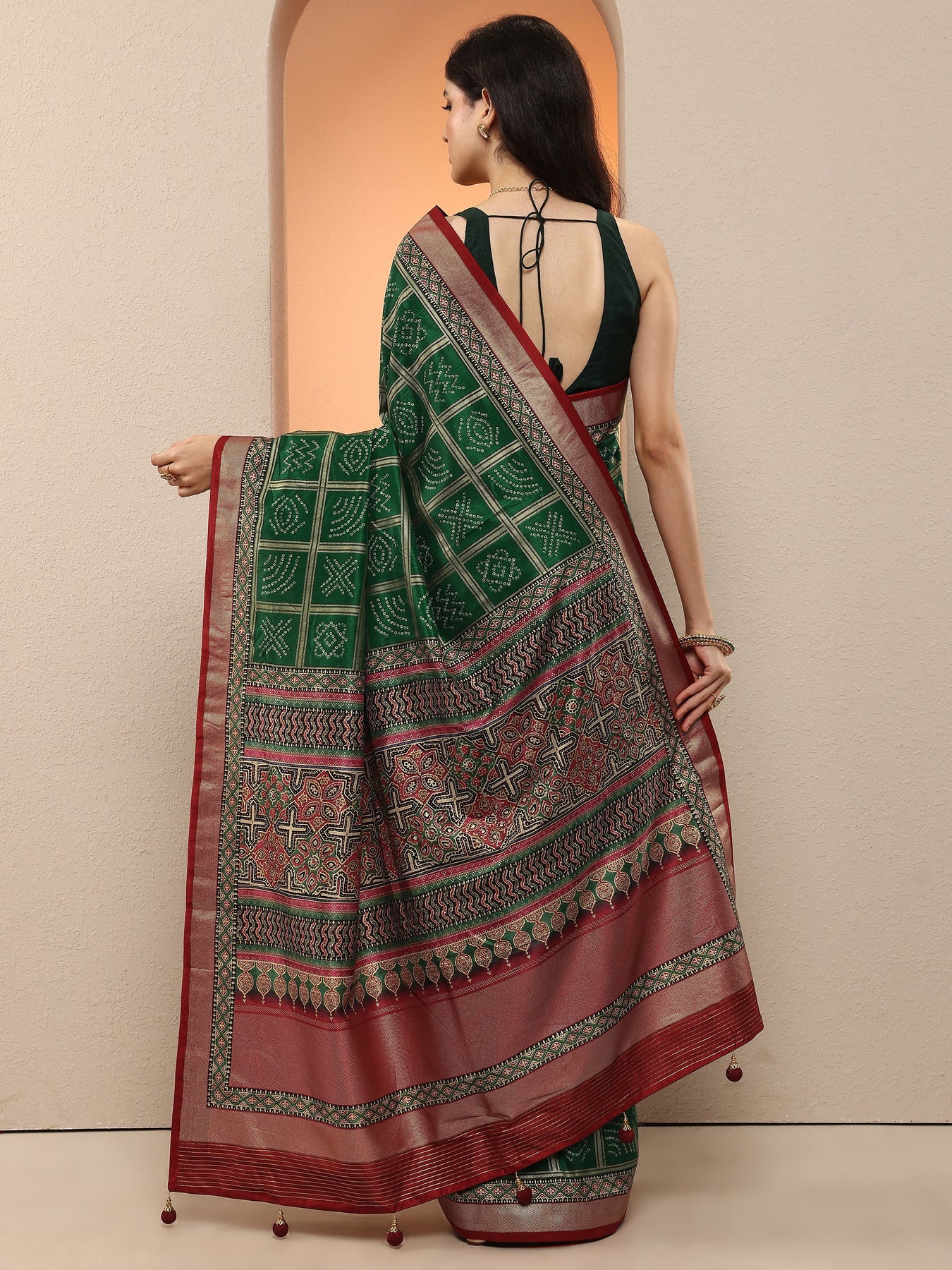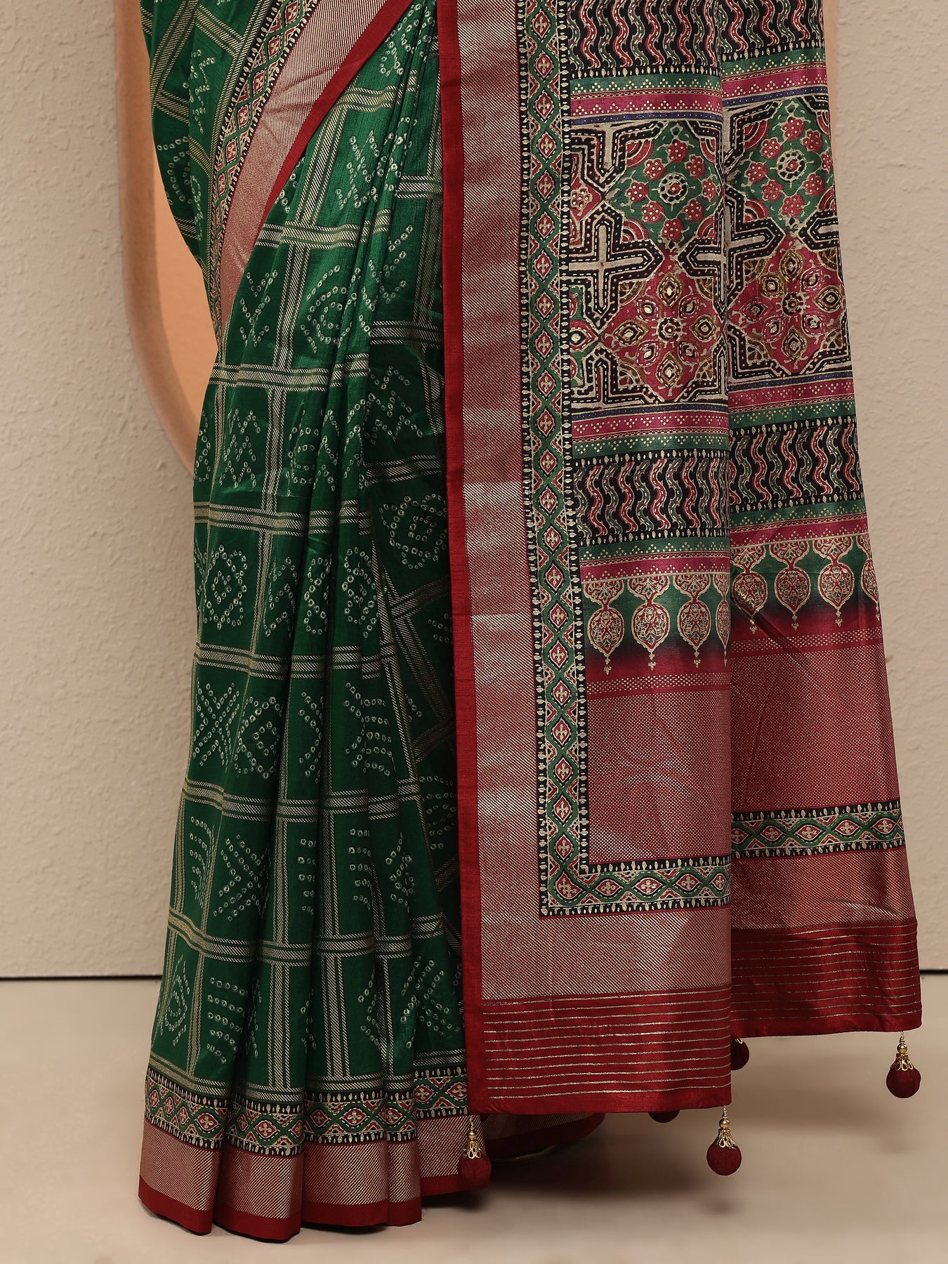 Green Bandhani Printed Silk Blend Saree With Unstitched Blouse Piece