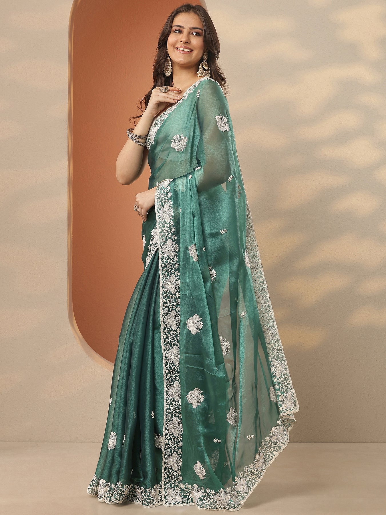 Green Embroidered Organza Saree With Unstitched Blouse Piece