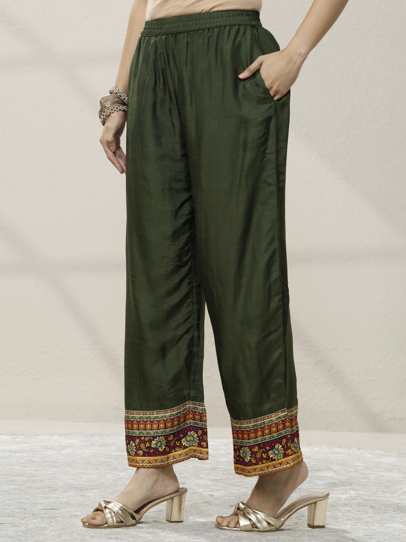Our 3-piece Green Silk blend Anarkali Kurta Set features a V-Neckline, Regular Sleeves, and statement yoke. Complemented with Straight Pants with a Partially Elasticated waistband and 2 pockets, and a Printed dupatta. Adorned with floral embroidered, this style is perfect for Dark Festive.