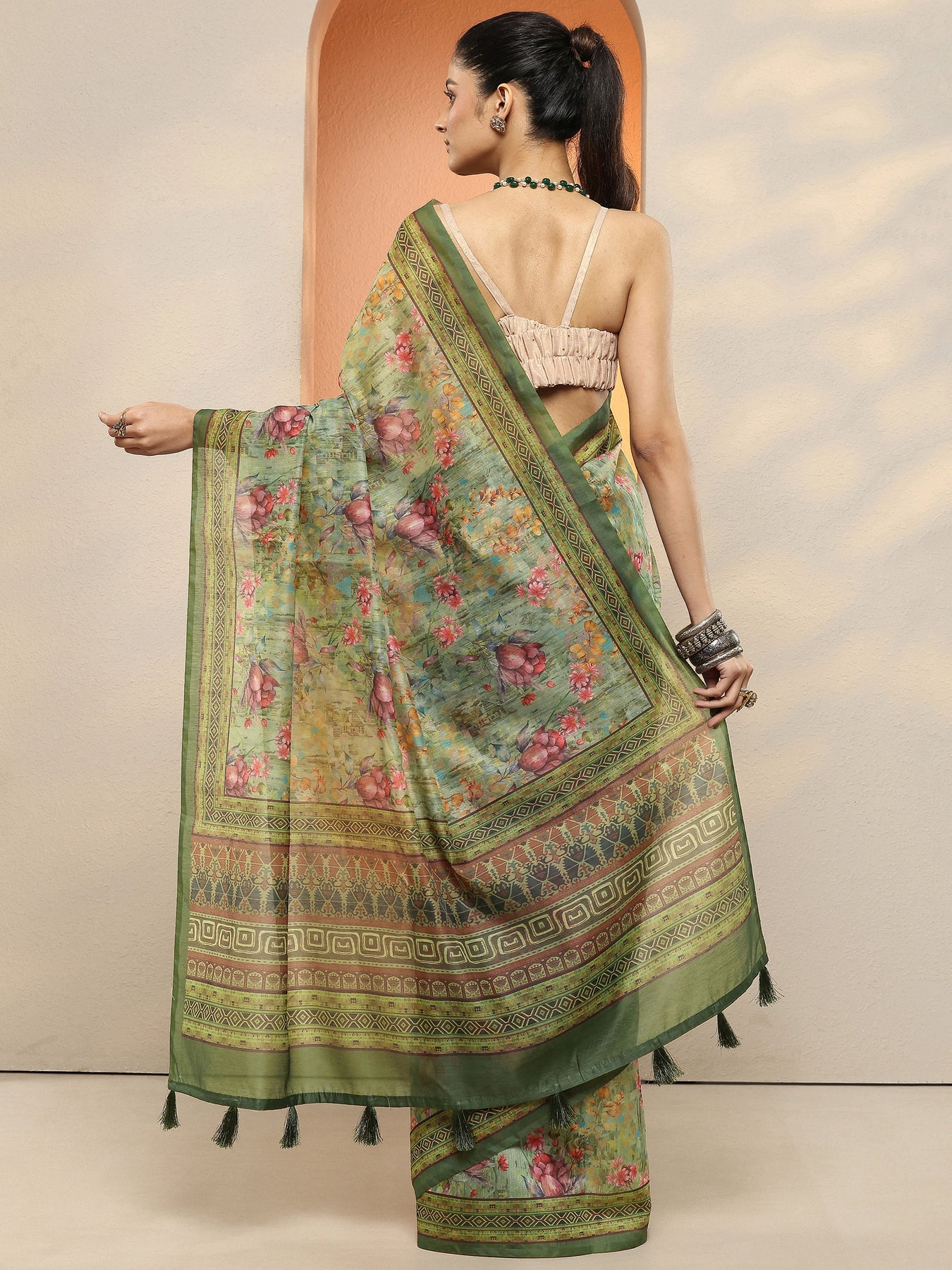 Green Printed Silk Blend Sarees With Unstitched Blouse Piece
