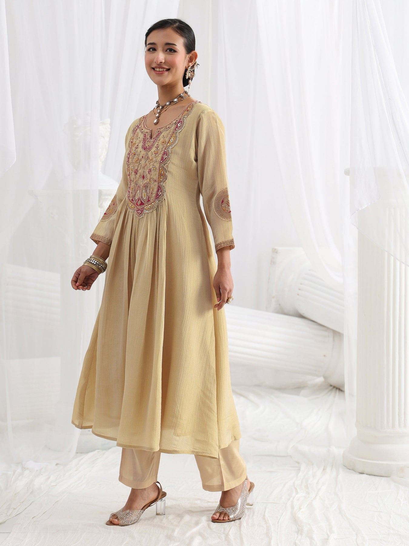 Libas Art Beige Paisley Embroidered Silk Blend A-Line Suit Set With Du