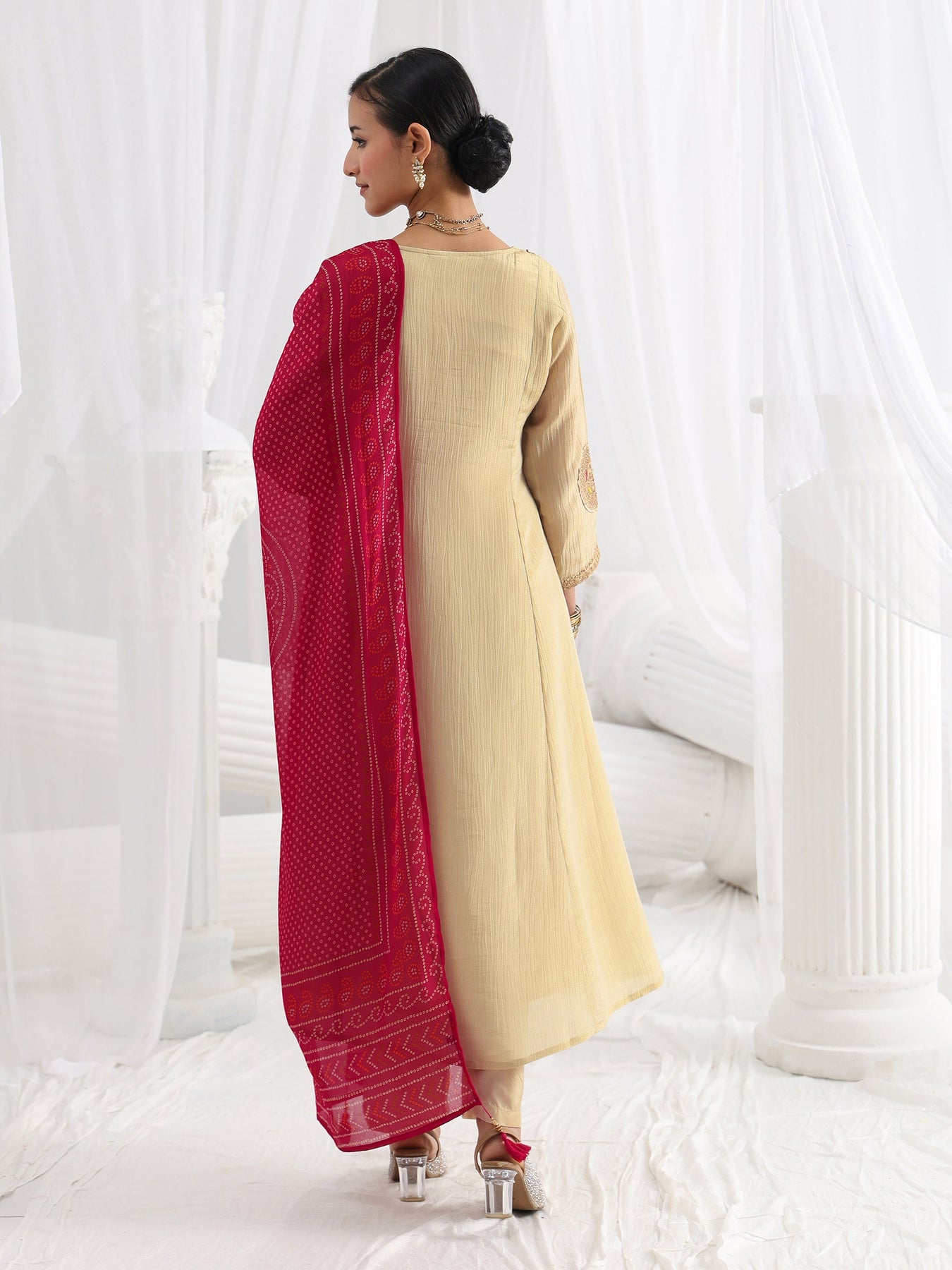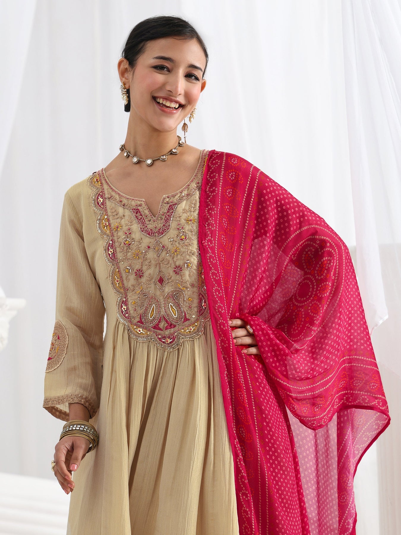 Libas Art Beige Paisley Embroidered Silk Blend A-Line Suit Set With Dupatta