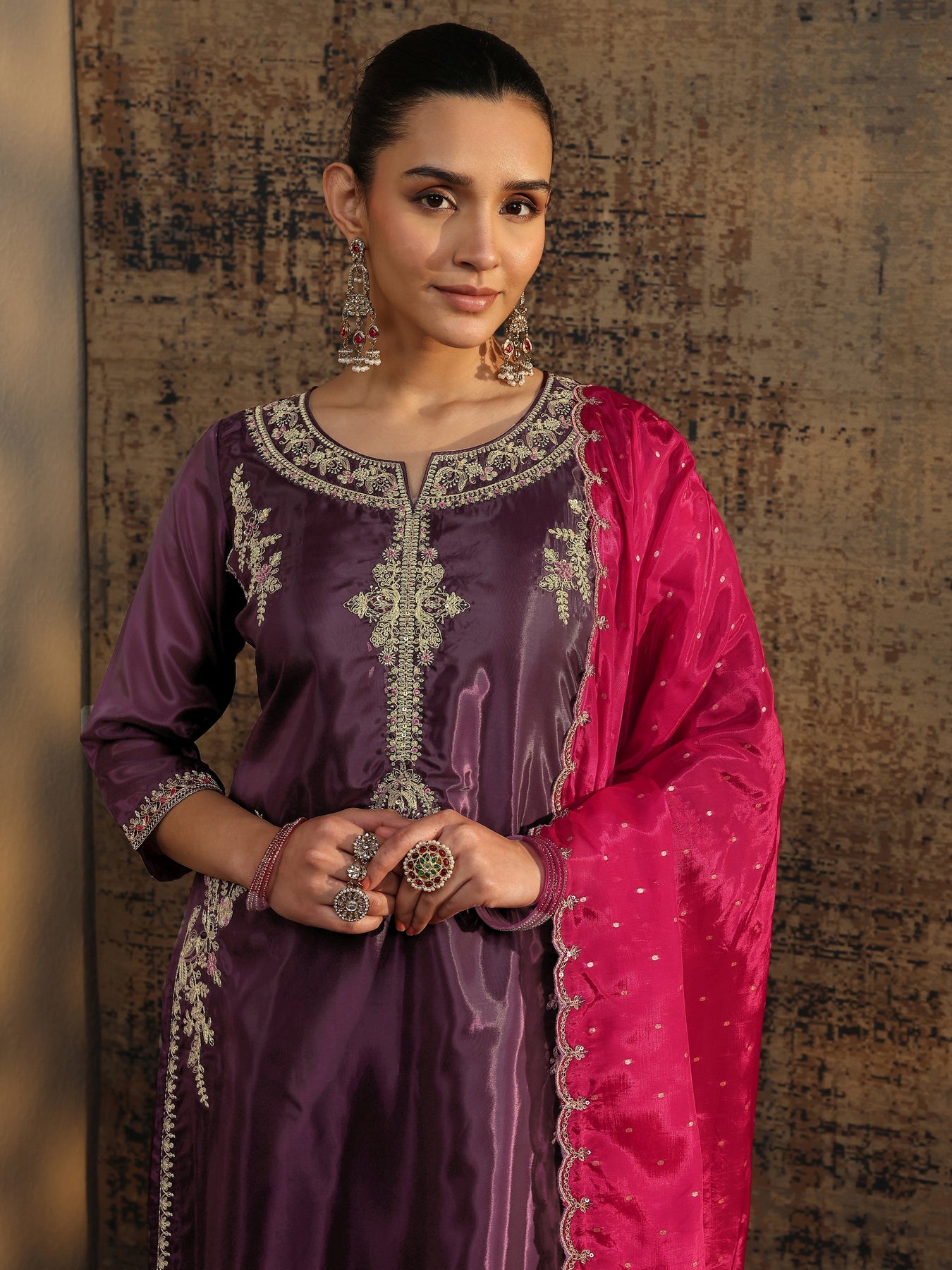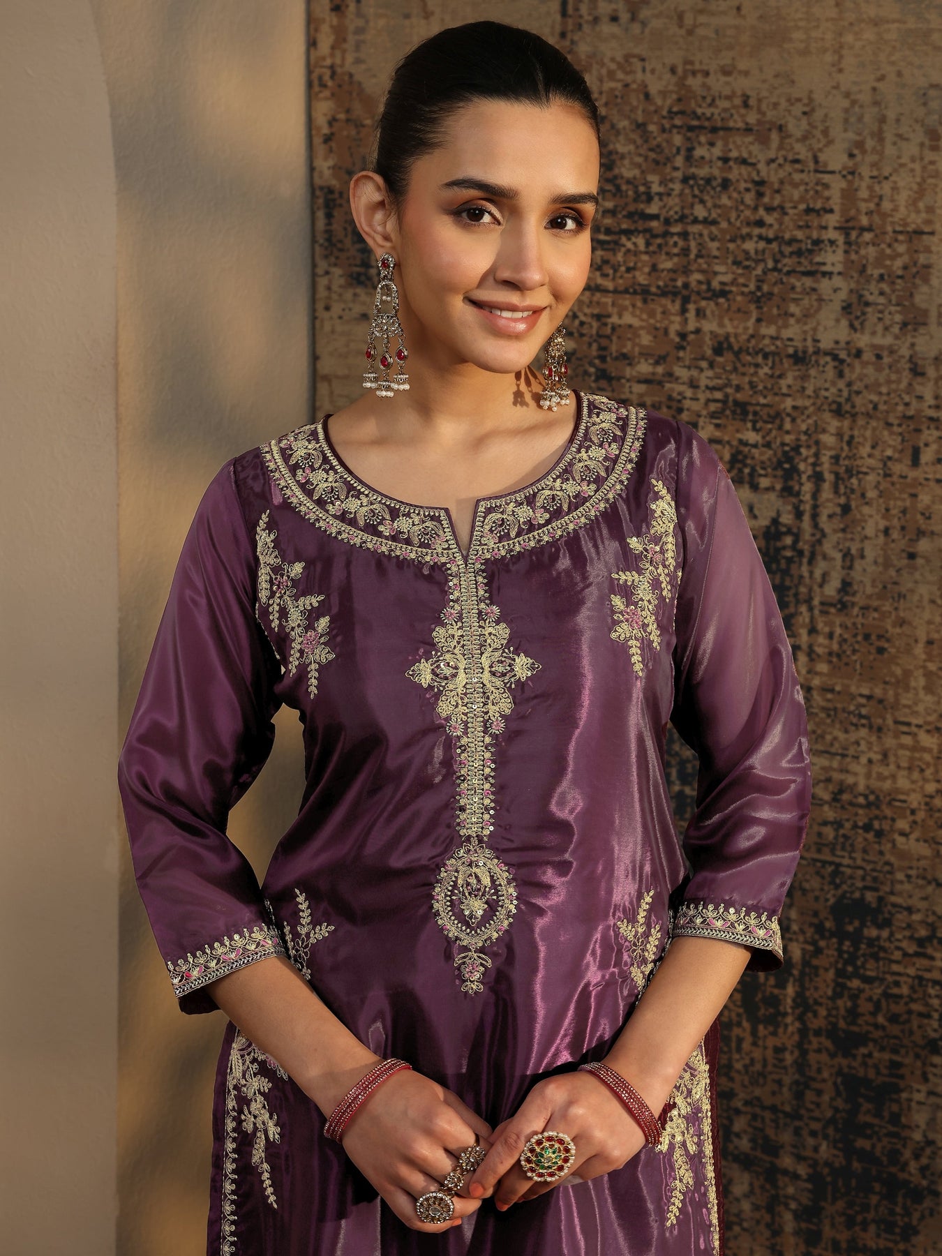 Our 3-piece burgundy organza straight-fit kurta set features a round neckline, bell sleeves, and statement yoke. Complemented with lining and straight pants with a partially elasticated waistband and 2 pockets, and an embroidered dupatta. Adorned with floral embellished, this style is perfect for dark festive occasions.
