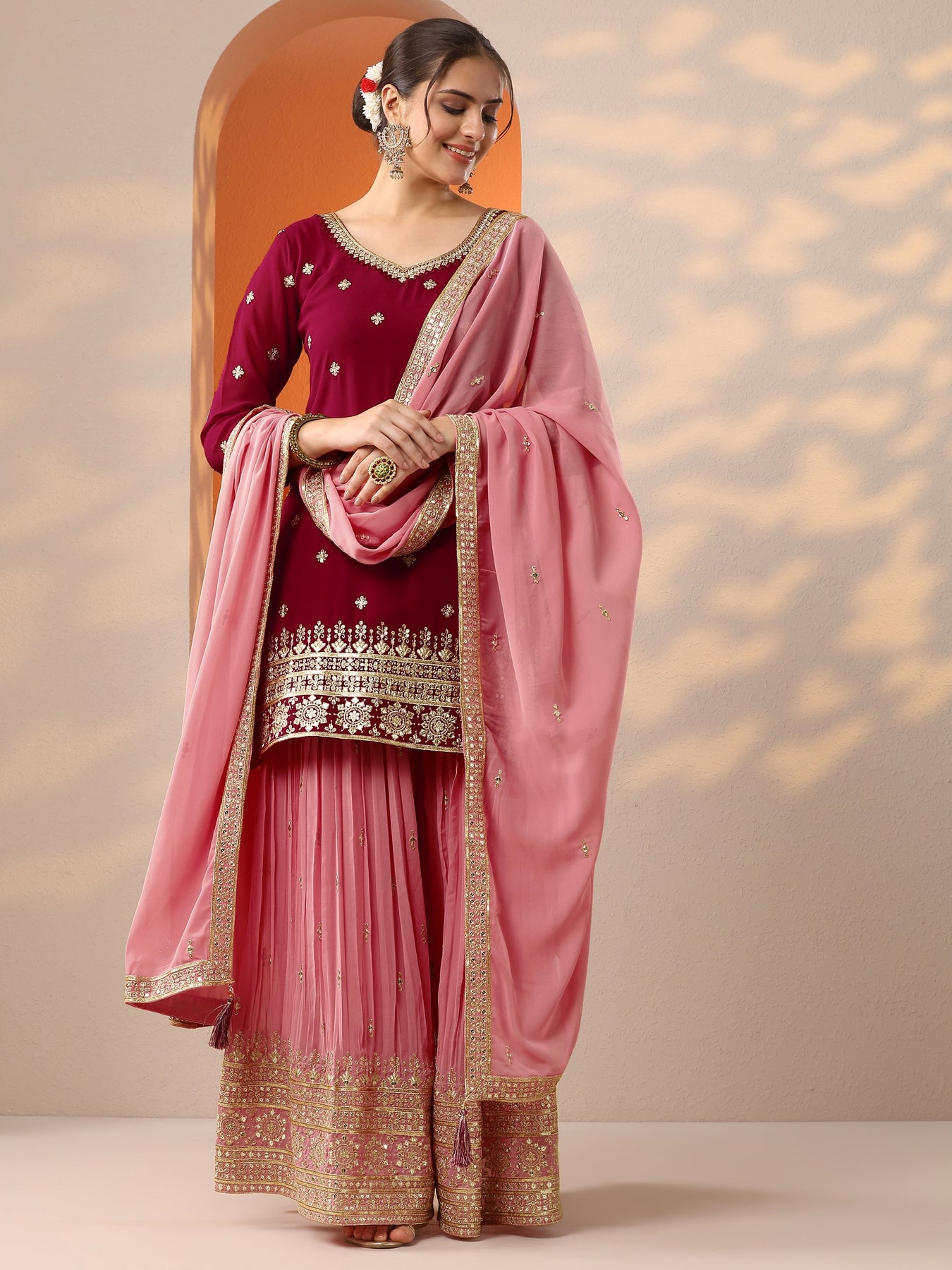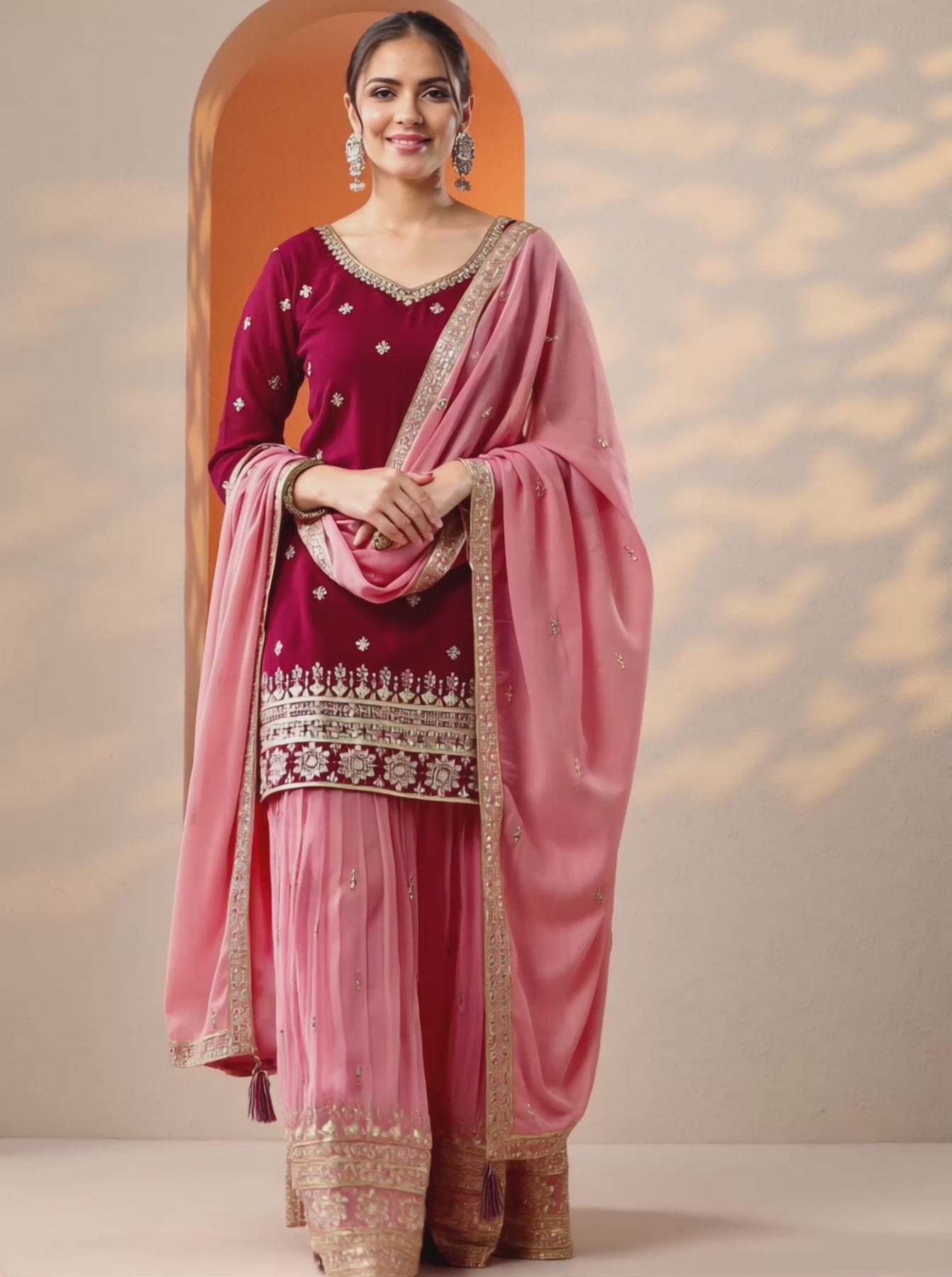 Our 3-piece maroon cotton straight-fit kurta set features a round neckline, regular sleeves, and a statement yoke. Complemented with sharara pants with a partially elasticated waistband and an embroidered dupatta. Adorned with embroidered embellishments, this style is perfect for festive occasions.