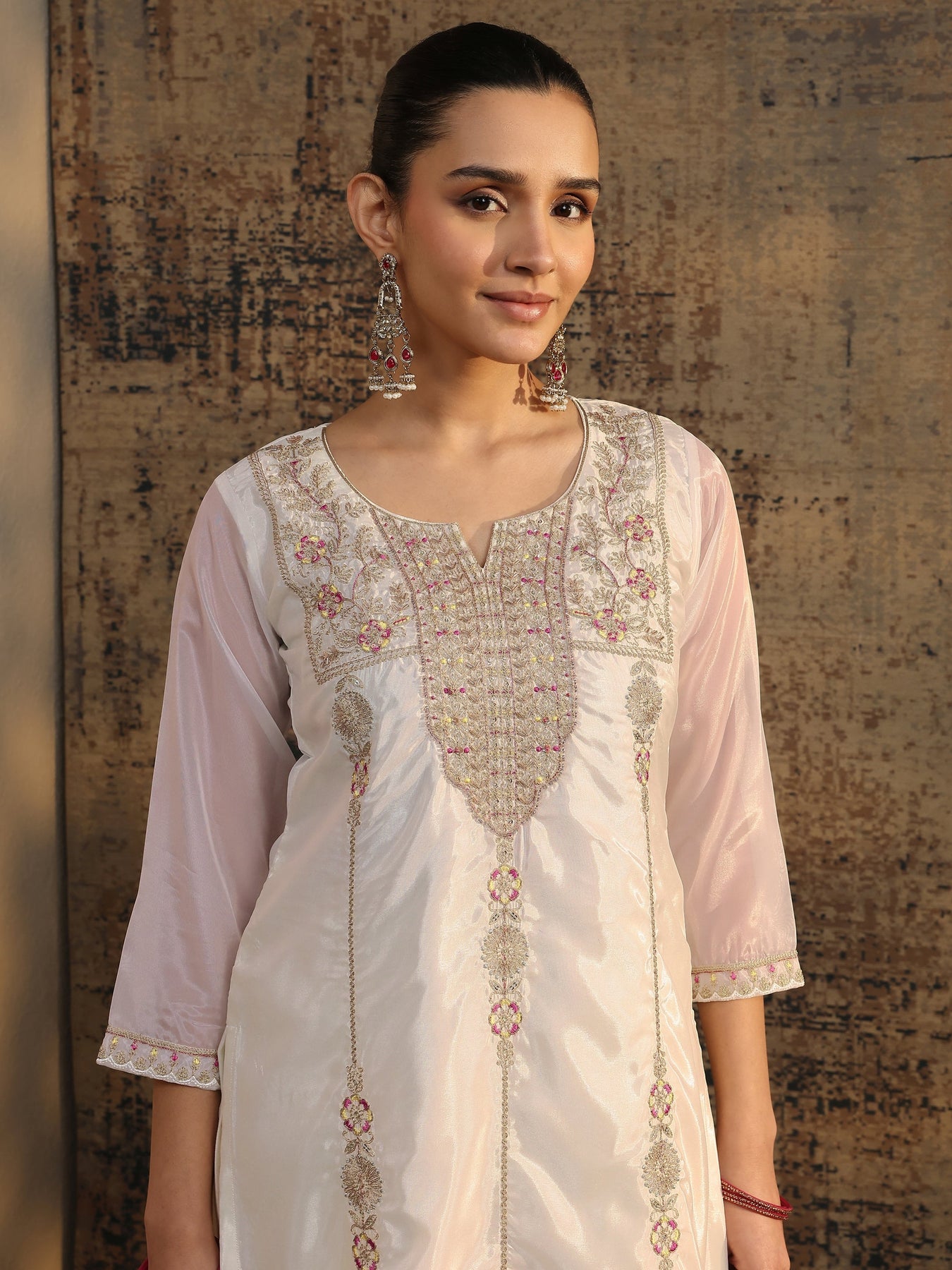 Our 3-piece Off White Organza Straight-Fit Kurta Set features a Round Neckline, Regular Sleeves, and statement yoke. Complemented with Lining and Straight Pants with a Partially Elasticated waistband and 2 pockets, and an Embroidered dupatta. Adorned with floral embellished, this style is perfect for Festive occasions.