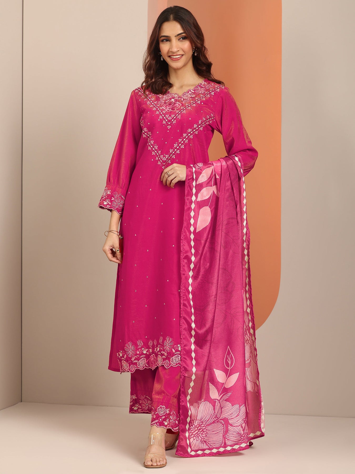 Magenta Embroidered Silk Blend Straight Suit Set With Dupatta