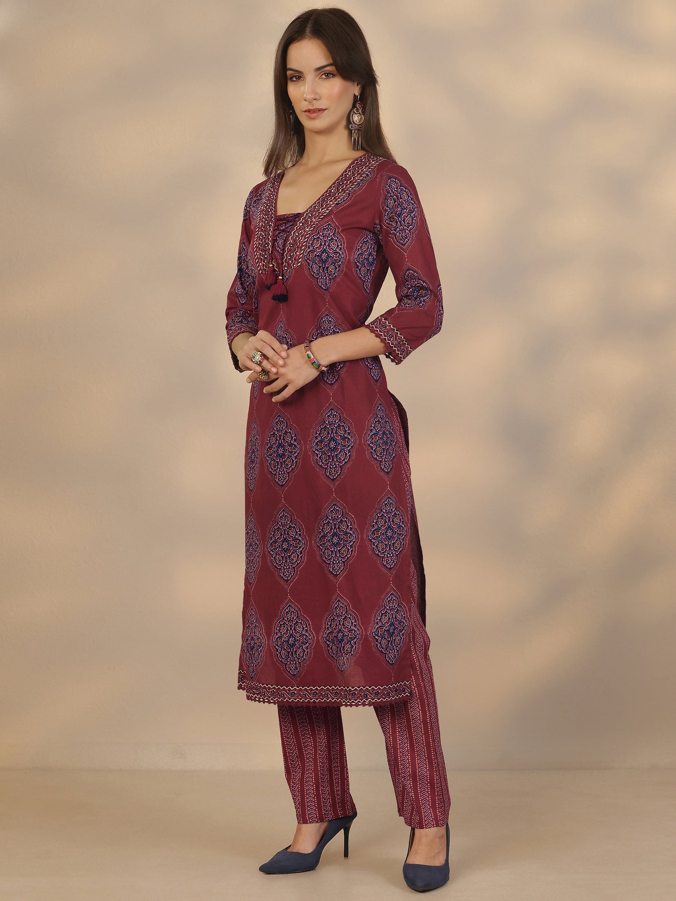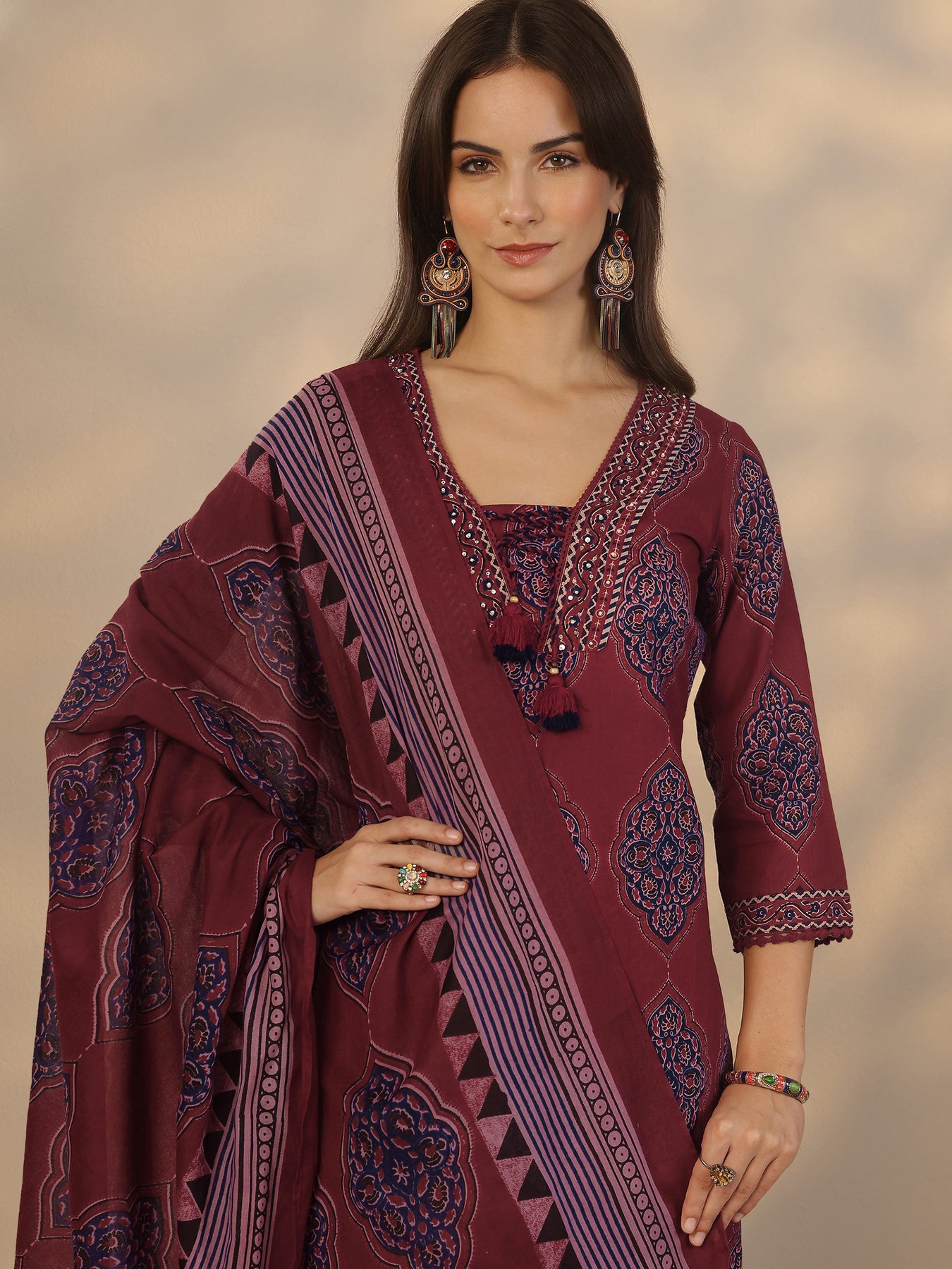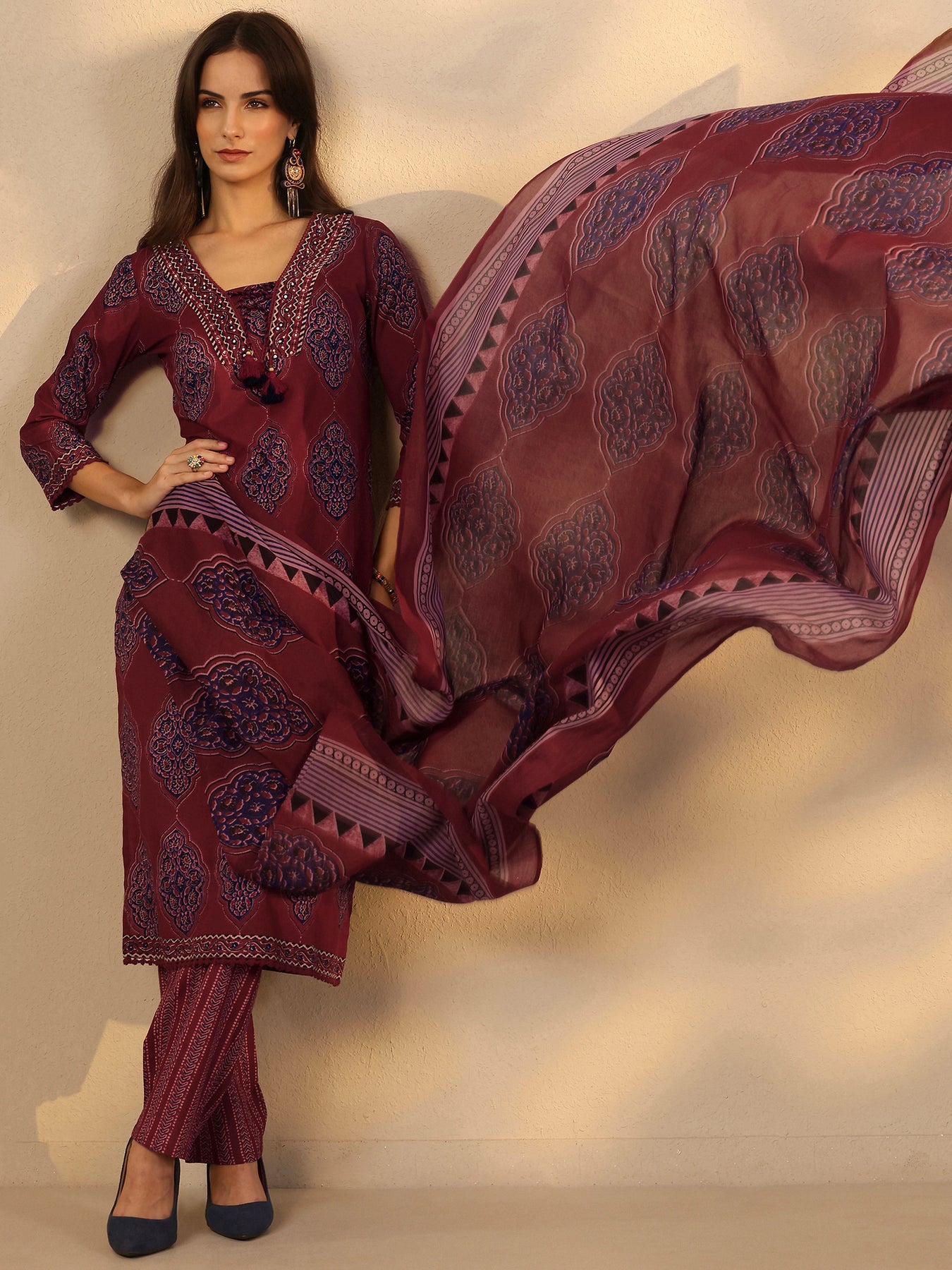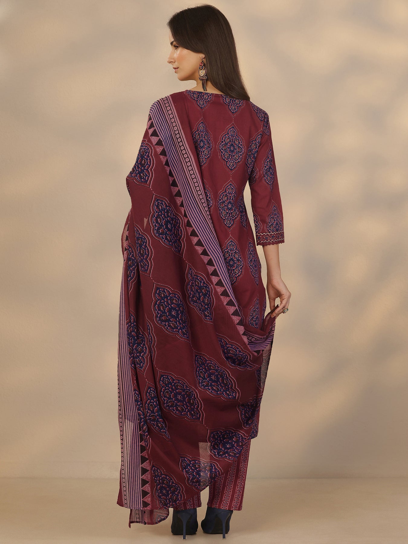 Maroon Printed Cotton Straight Suit Set With Dupatta