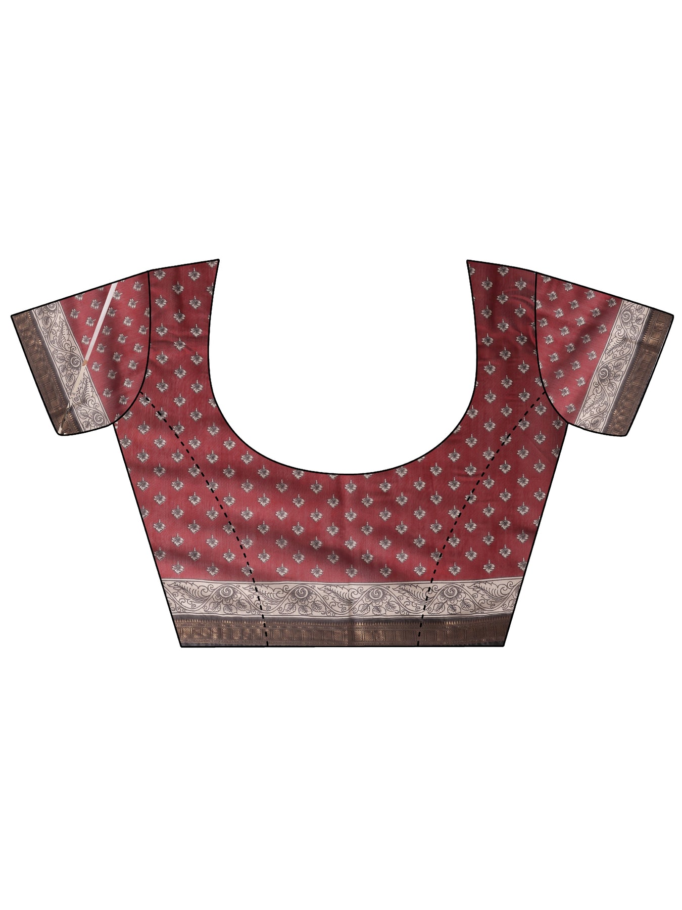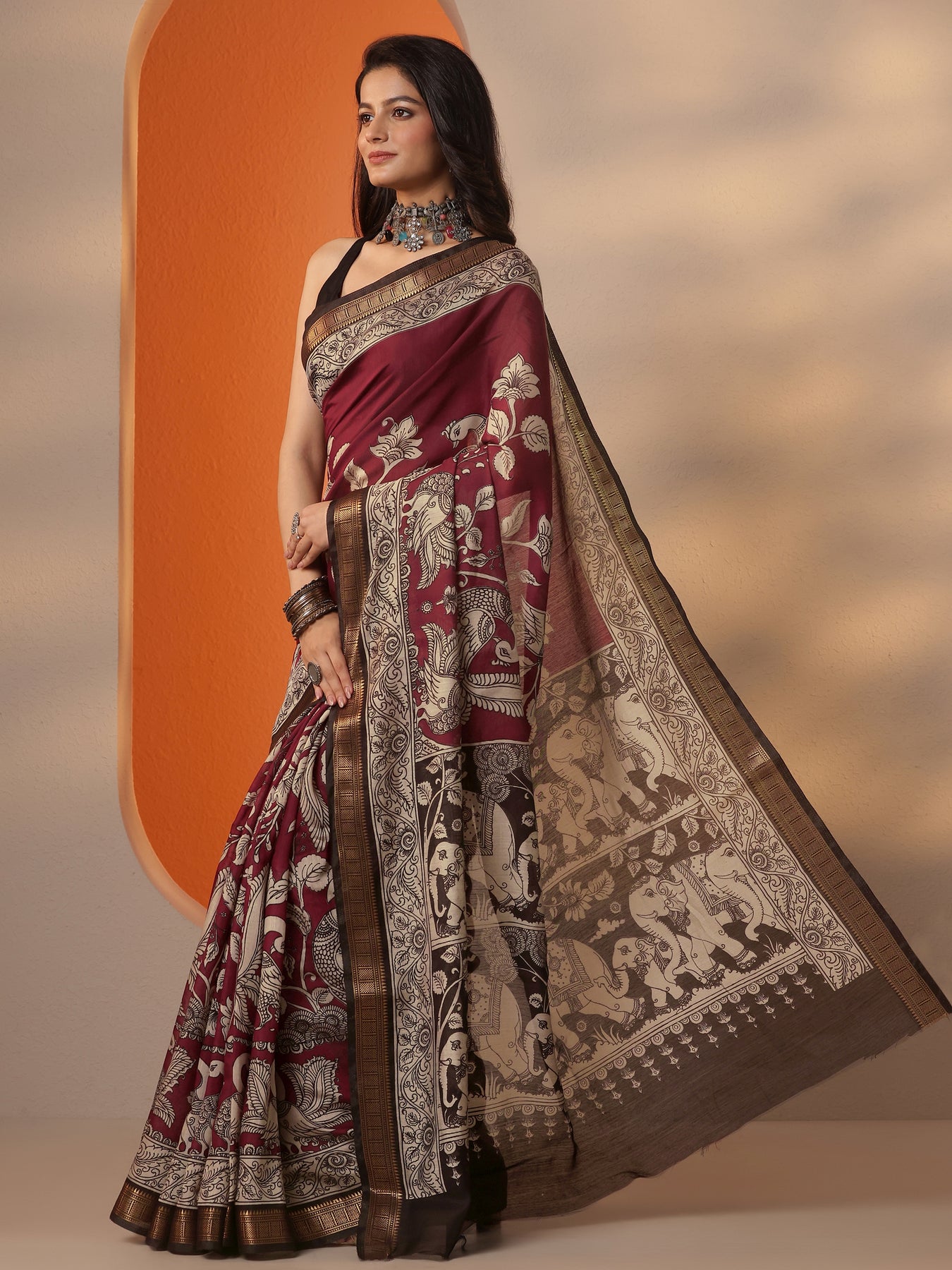 Maroon Printed Silk Blend Saree With Unstitched Blouse Piece