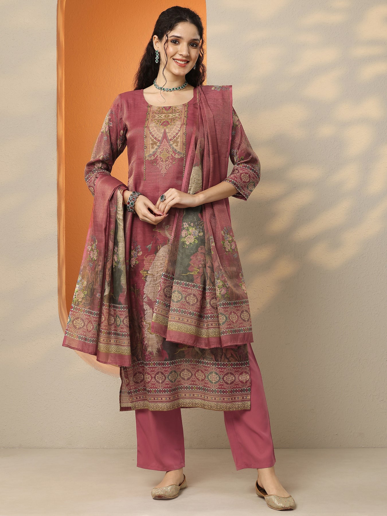 Maroon Printed Silk Blend Straight Suit Set With Dupatta