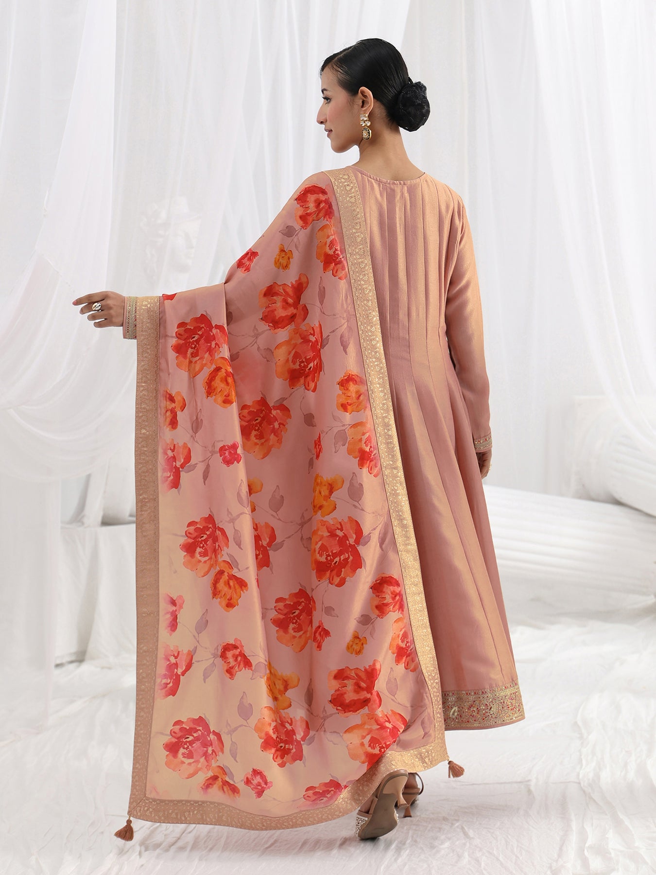 Our 3-piece peach silk blend Anarkali kurta set features a V-neckline, regular sleeves, and statement yoke. Complemented with straight pants with a partially elasticated waistband and 2 pockets, and a printed dupatta. Adorned with floral zari embroidered, this style is perfect for festive occasions.