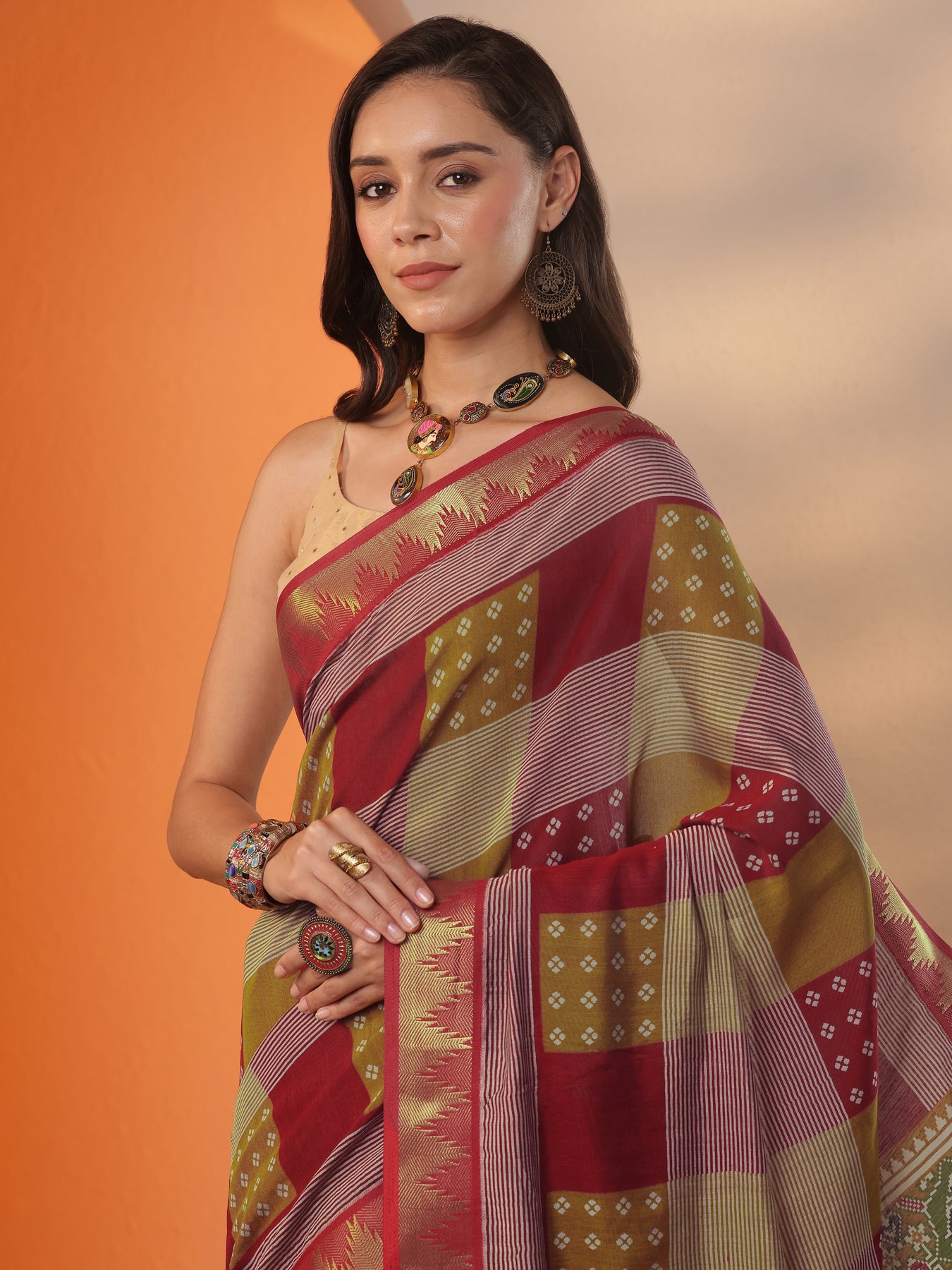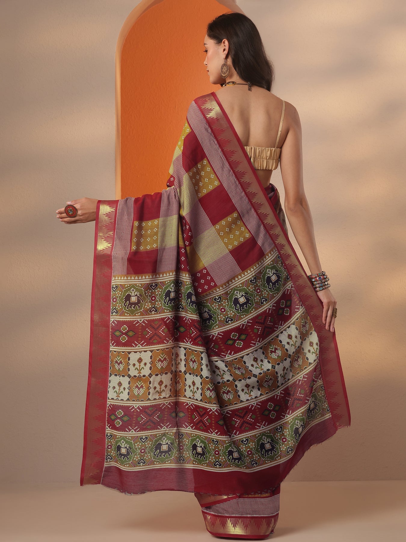 Multi Printed Silk Blend Saree With Unstitched Blouse Piece
