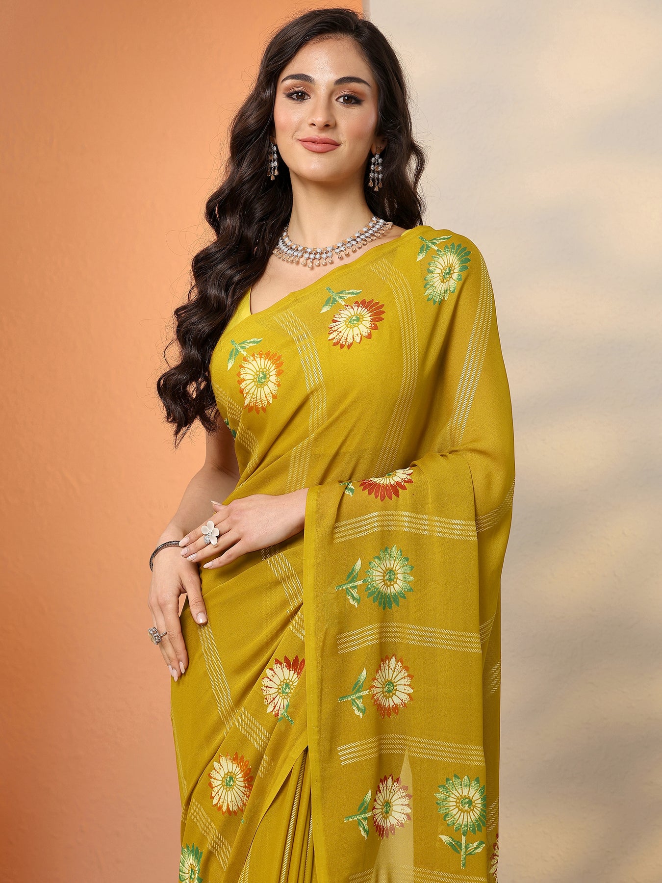 Mustard Printed Georgette Saree With Unstitched Blouse Piece