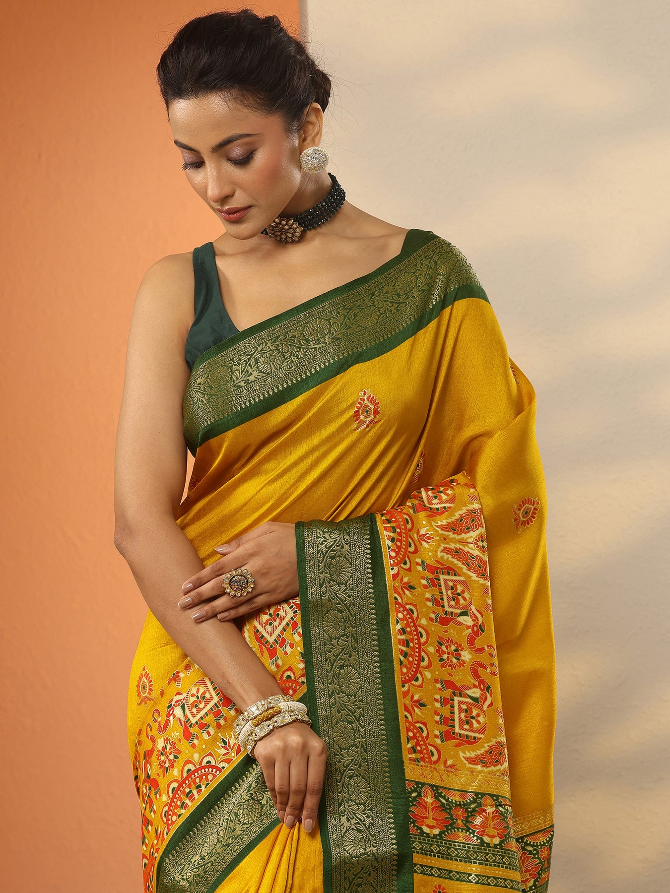 Mustard Printed Silk Blend Saree With Unstitched Blouse Piece
