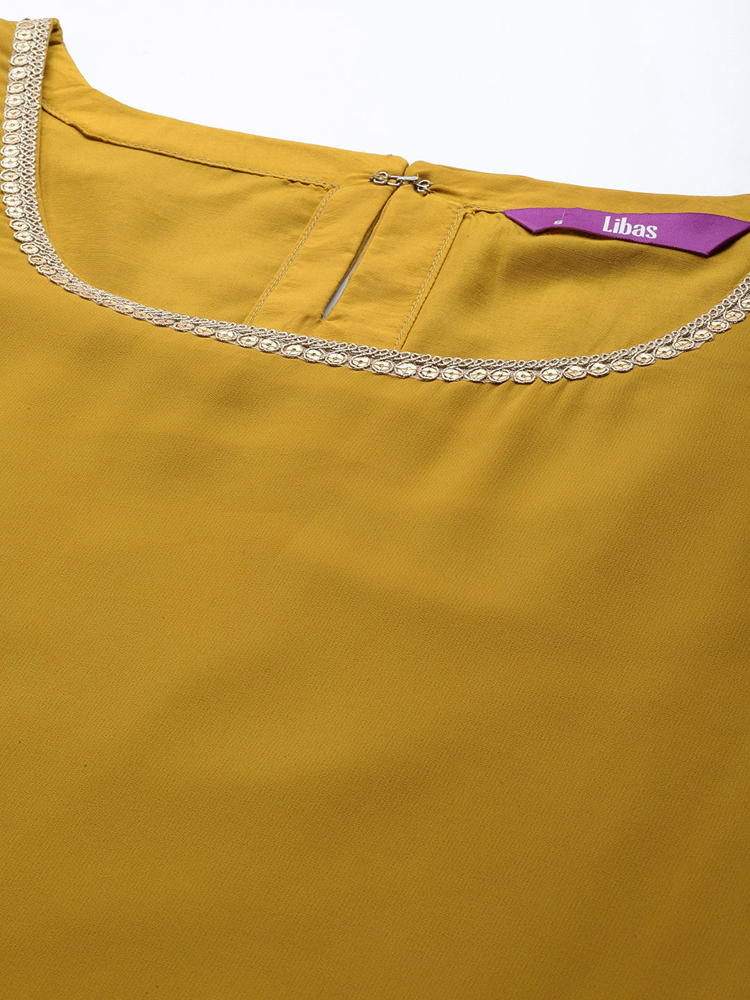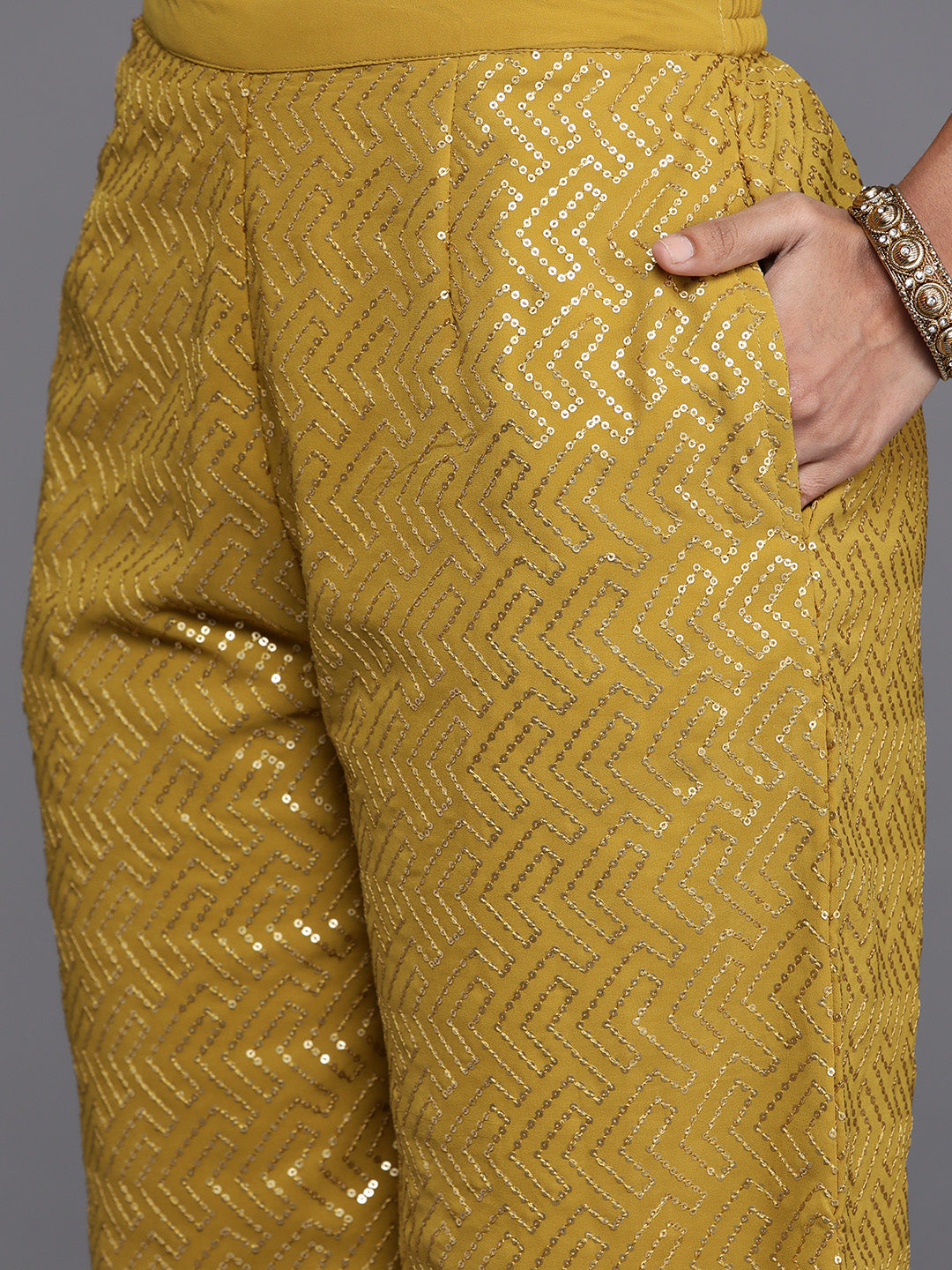 Mustard Solid Georgette Straight Kurta With Palazzos & Dupatta