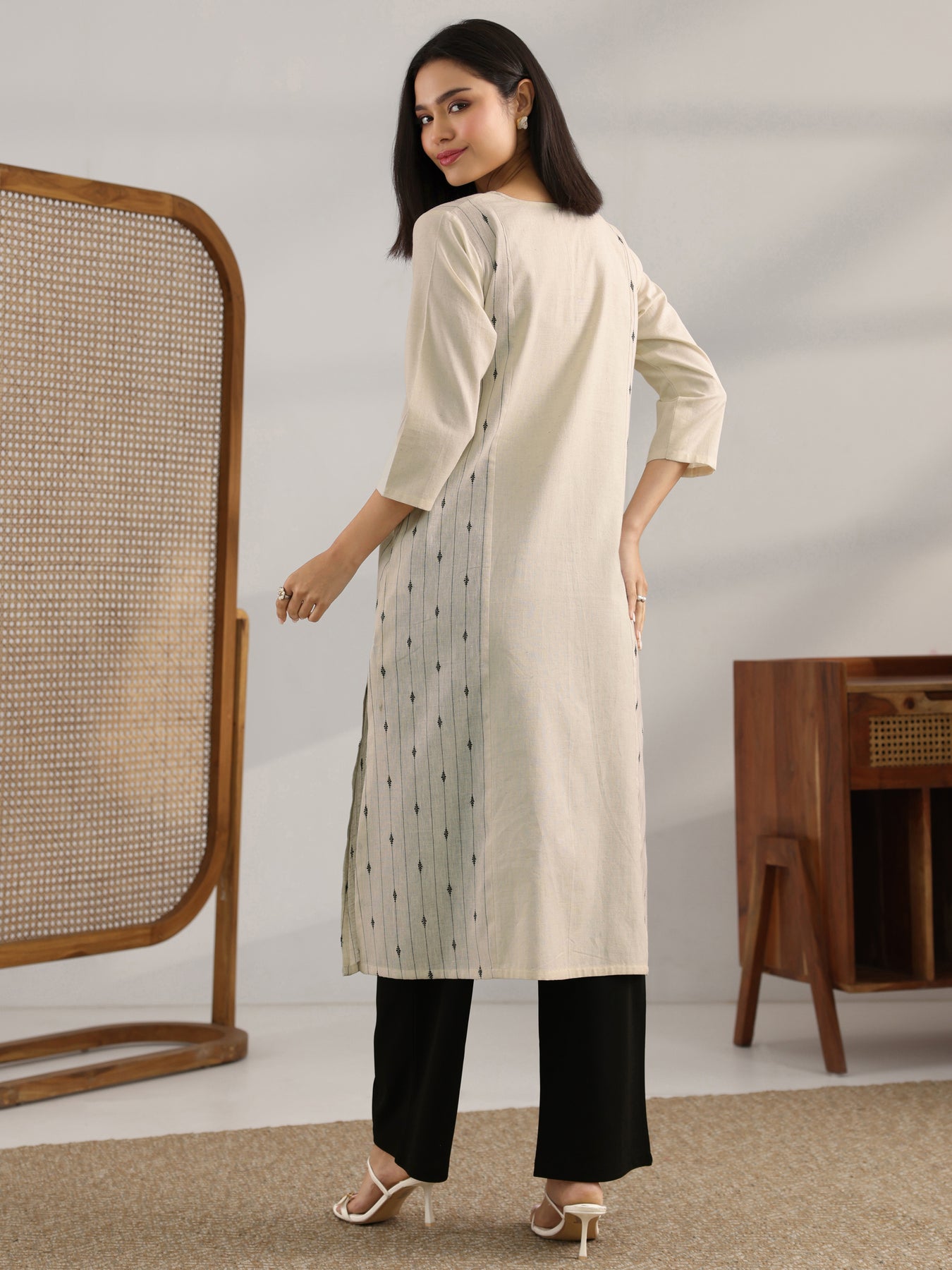 Our 1-piece off white cotton blend straight-fit kurta features a V-neckline, regular sleeves, and statement yoke. Adorned with Geometric Print, this style is perfect for work wear and casual wear.