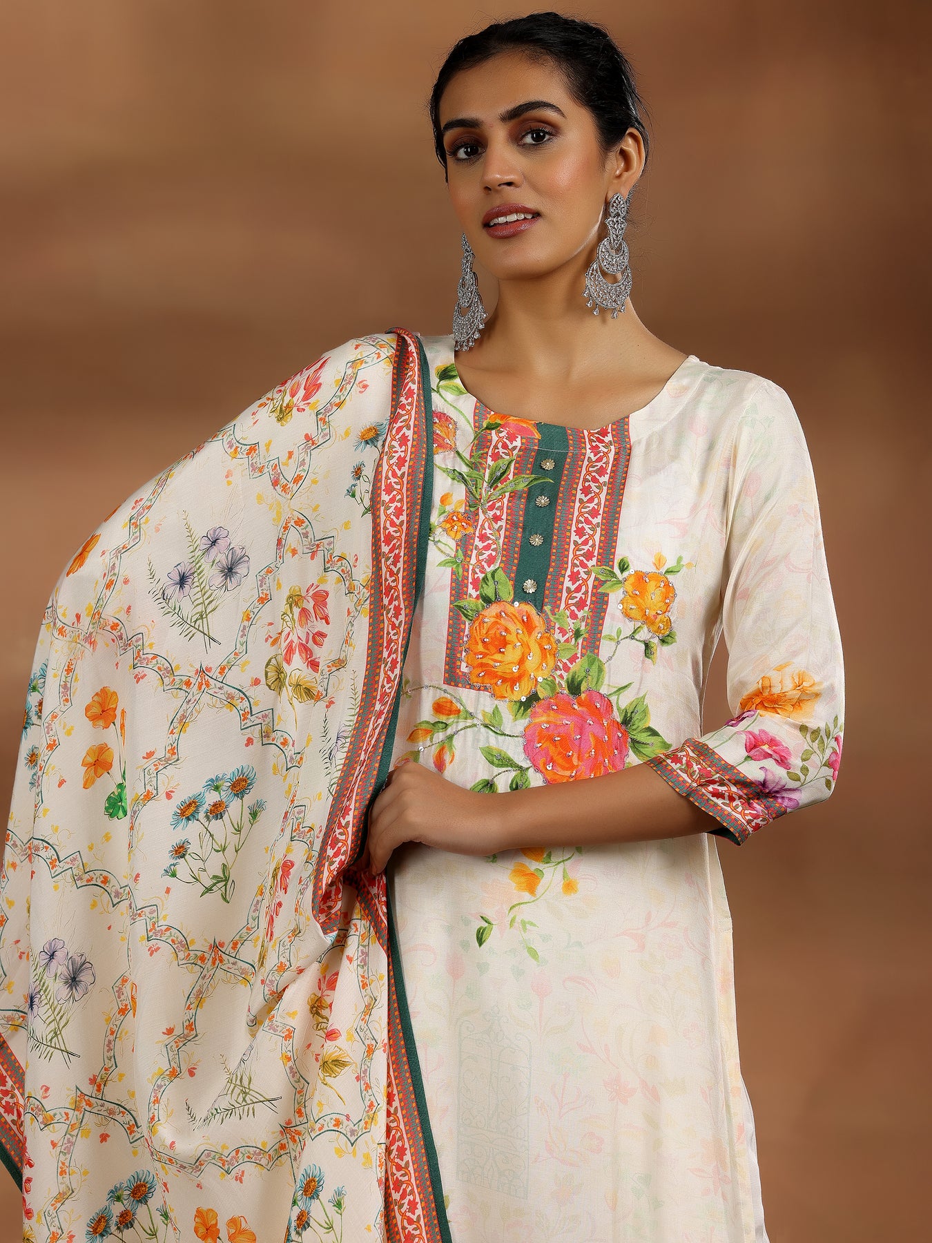 Our 3-piece off-white printed muslin suit set features a straight-fit kurta with a round neckline and three-quarter sleeves. Complemented with trousers with a fully elasticated waistband and roomy pockets, and a dupatta. Highlighted with captivating floral prints and stylish button accents, this style is perfect for casual outings.