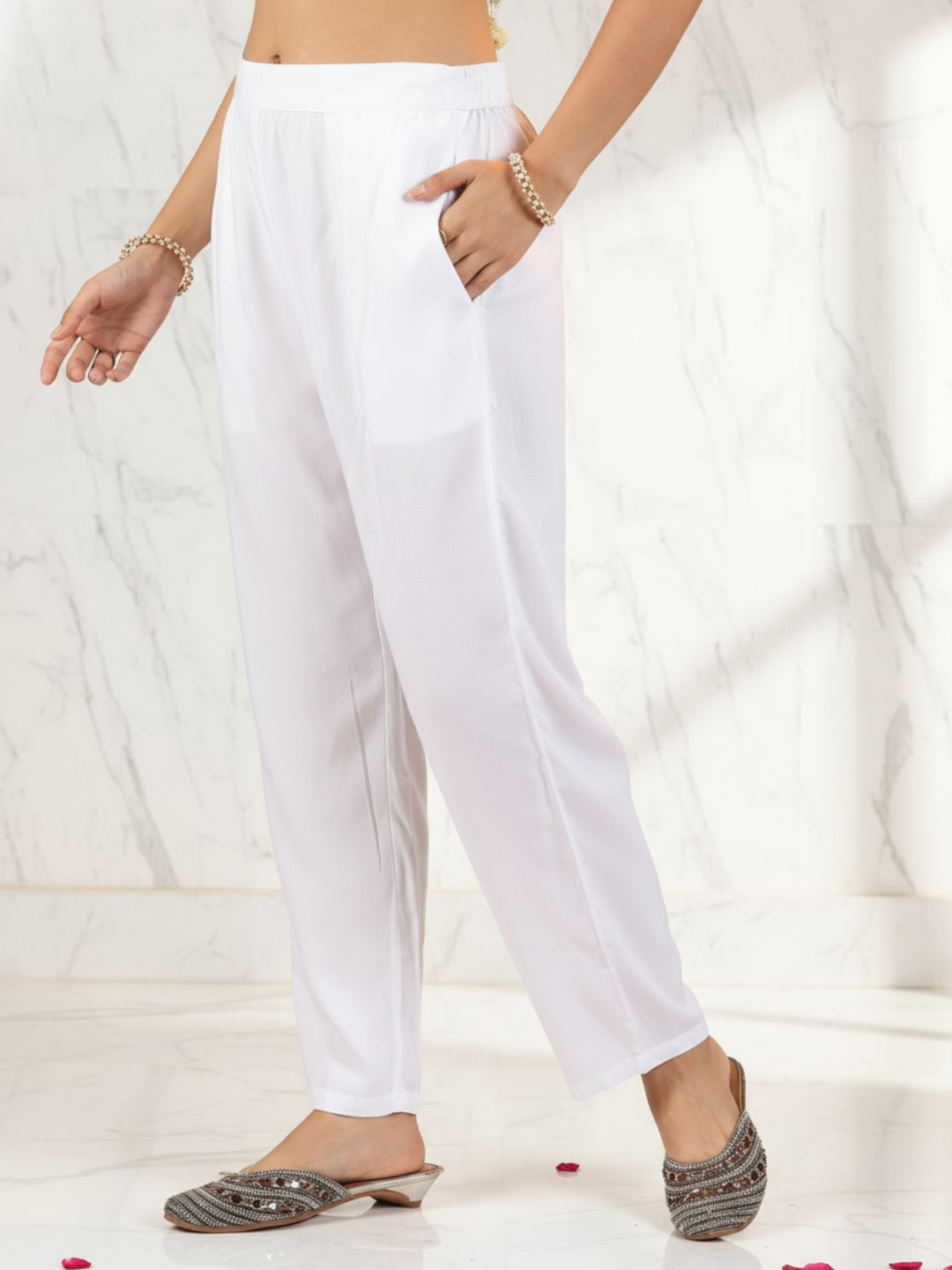 Our 3-piece off-white printed organza Anarkali suit set features a flowy kurta with a V-neckline, three-quarter sleeves, and a statement yoke. Complemented with trousers with a partially elasticated waistband and roomy pockets, and a dupatta. Highlighted with sequins and thread work, this style is perfect for festive celebrations.