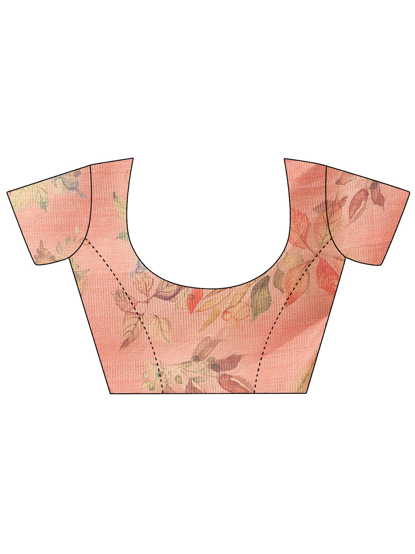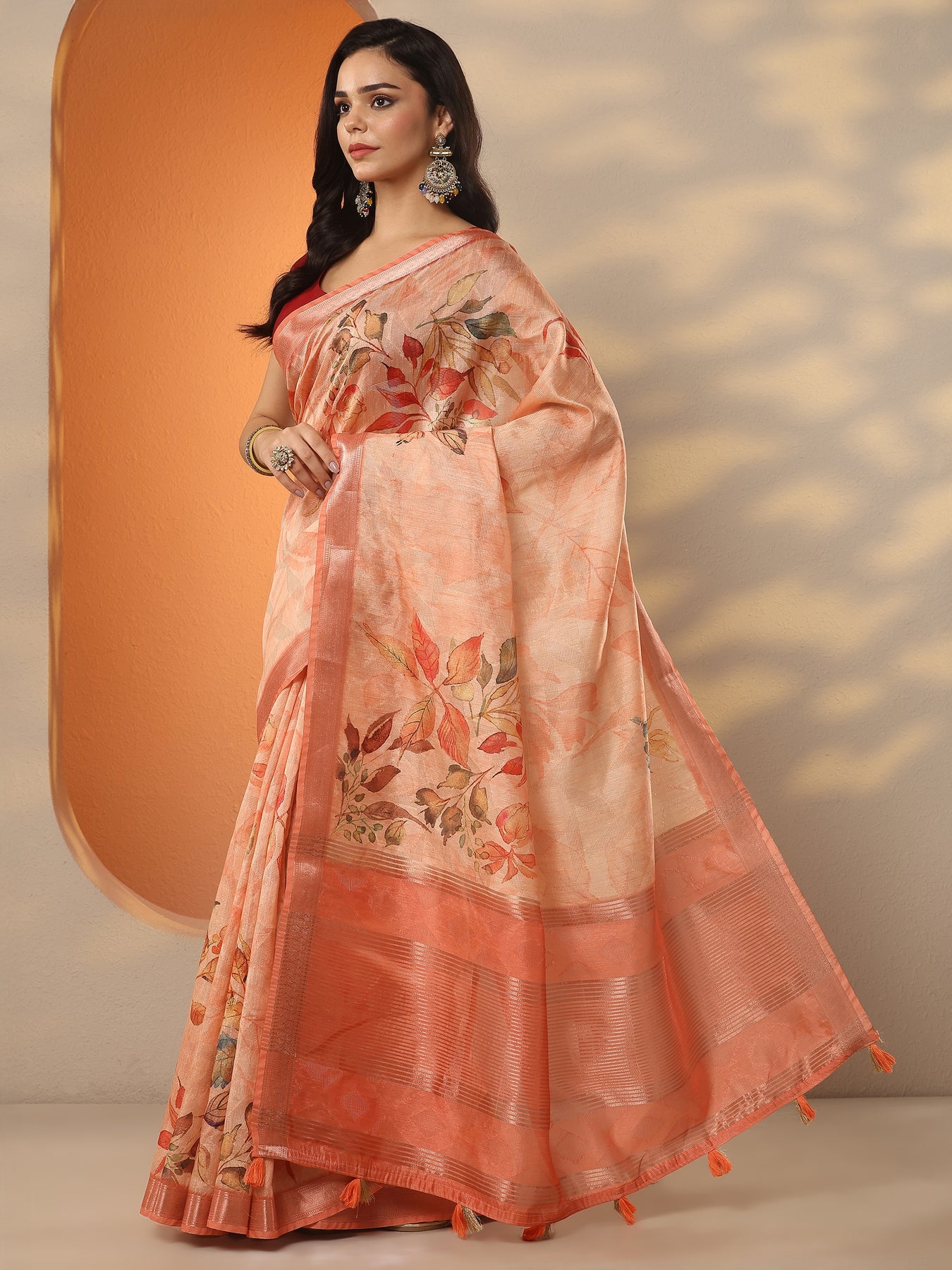 Orange Printed Silk Blend Saree With Unstitched Blouse Piece