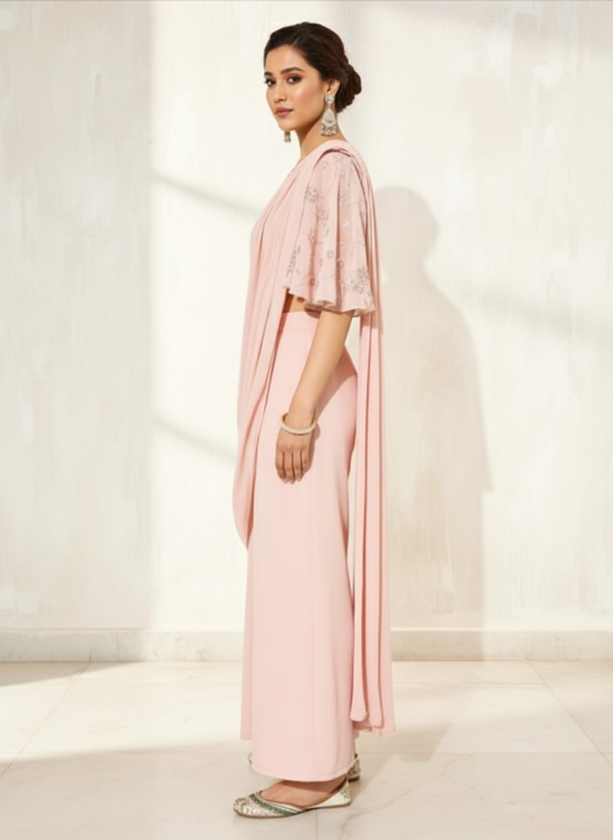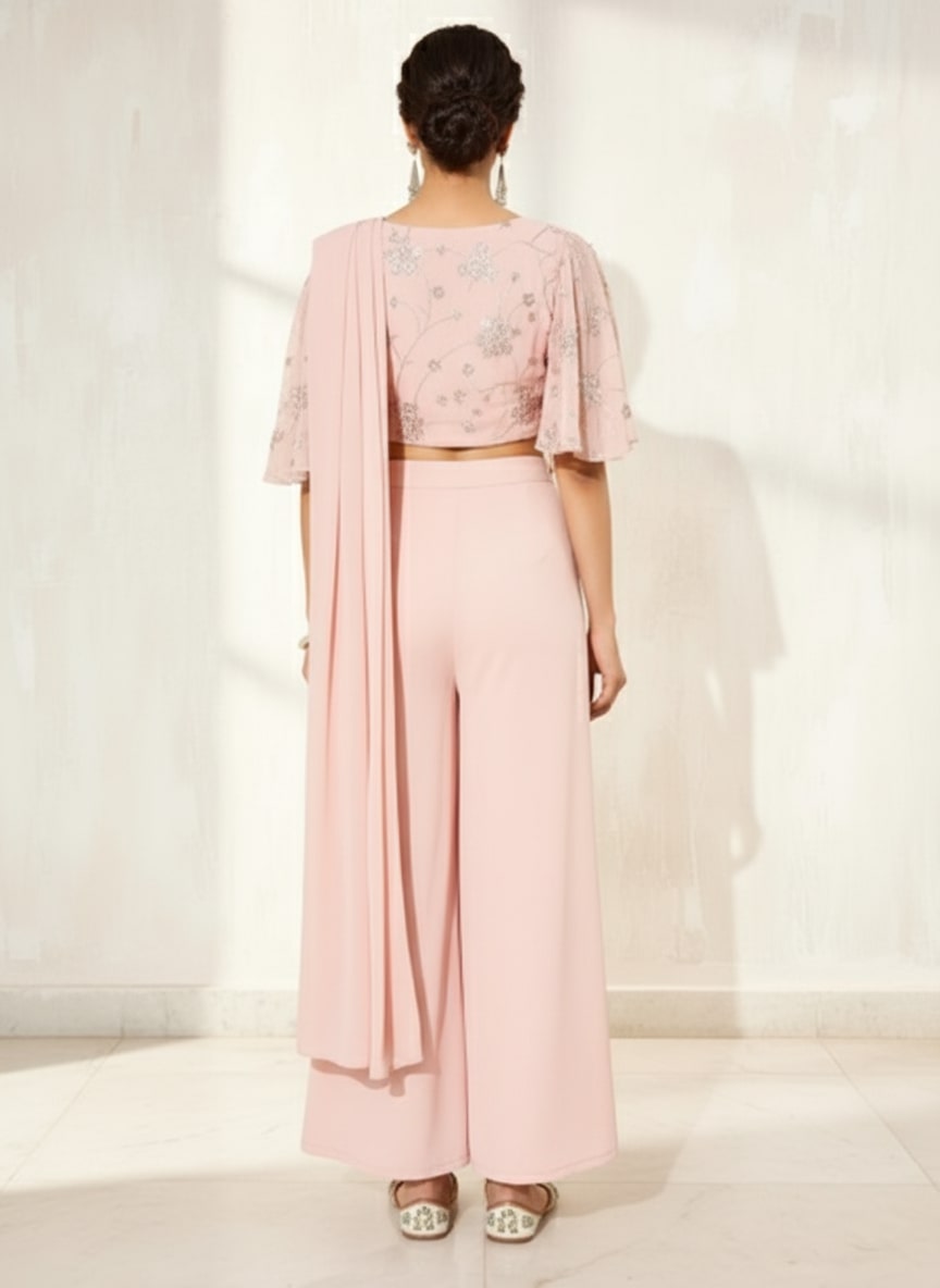 Our pink and gold toned georgette palazzo saree features a stitched blouse with flared three-quarter sleeves. Adorned with floral embroidery and pleated pallu, this elegant style is ideal for light festivities.