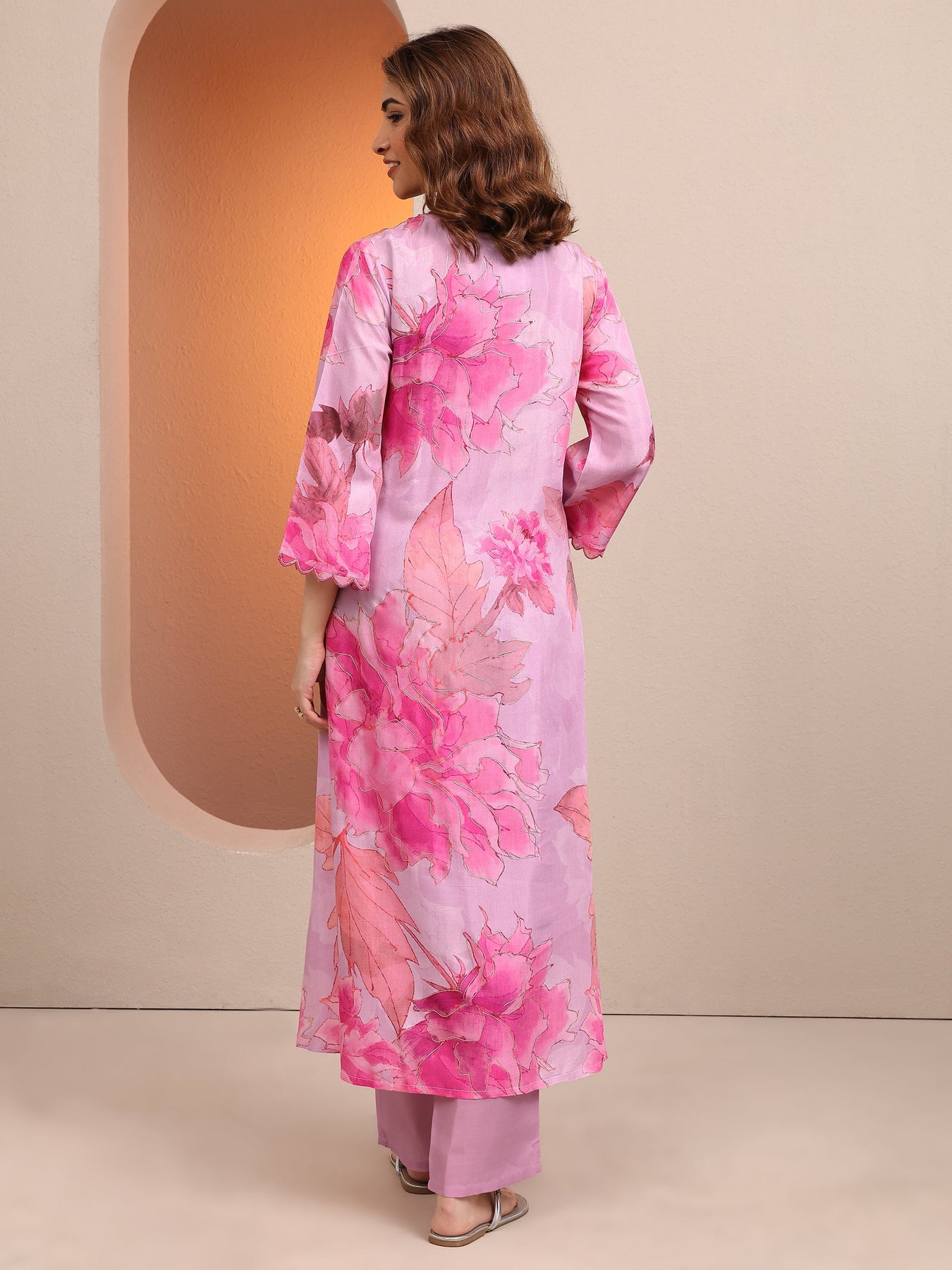 Our 2-piece Pink Muslin a-line features a V-Neckline, Regular Sleeves, and statement yoke. Complemented with Straight Pants with a Partially Elasticated waistband and 2 pockets. Adorned with floral printed, this style is perfect for Work Wear and Casual Wear.