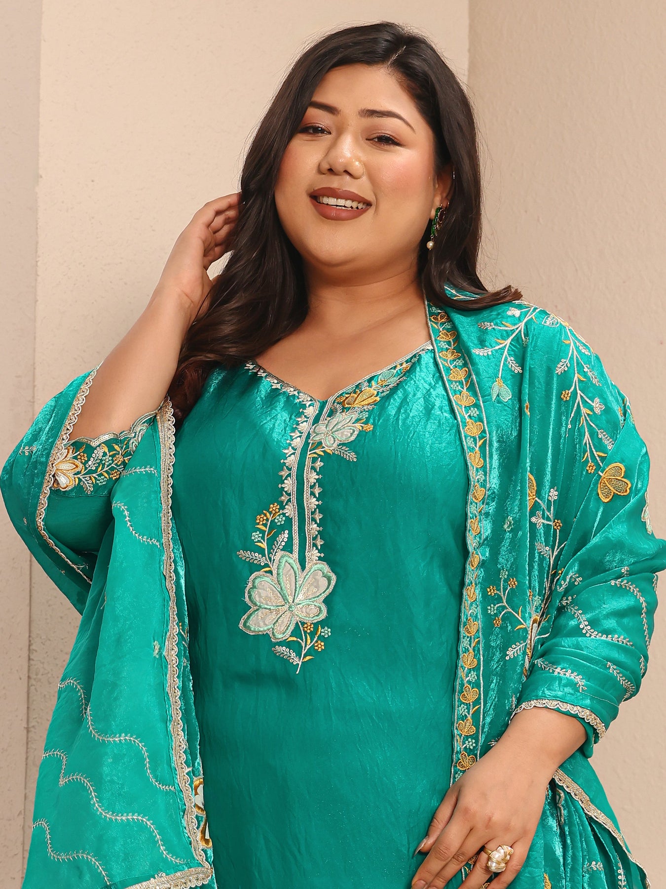 Plus Size Floral Embroidered Organza Straight Suit Set With Dupatta