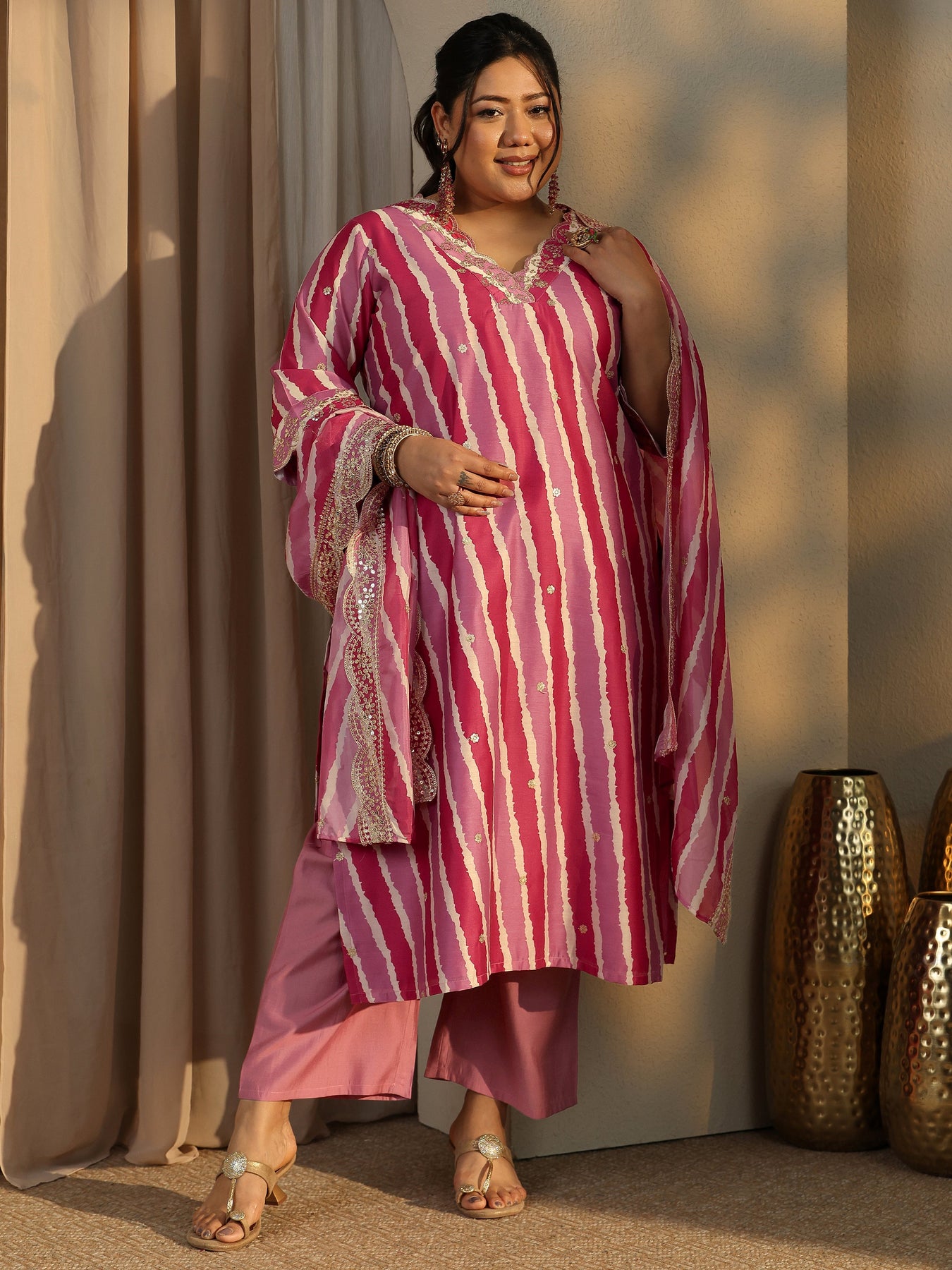 Our 3-piece pink silk blend straight-fit kurta set features a V-neckline, regular sleeves, and statement yoke. Complemented with lining and straight pants with a partially elasticated waistband and 2 pockets, and a Leheriya print dupatta. Adorned with leheriya printed, this style is perfect for festive occasions.