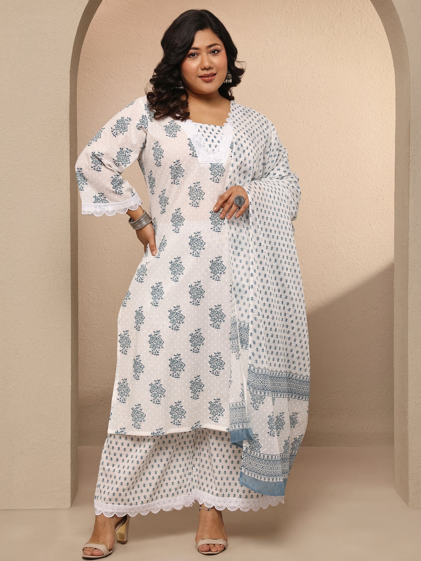 Plus Size Off White Printed Cotton Suit Set With Dupatta
