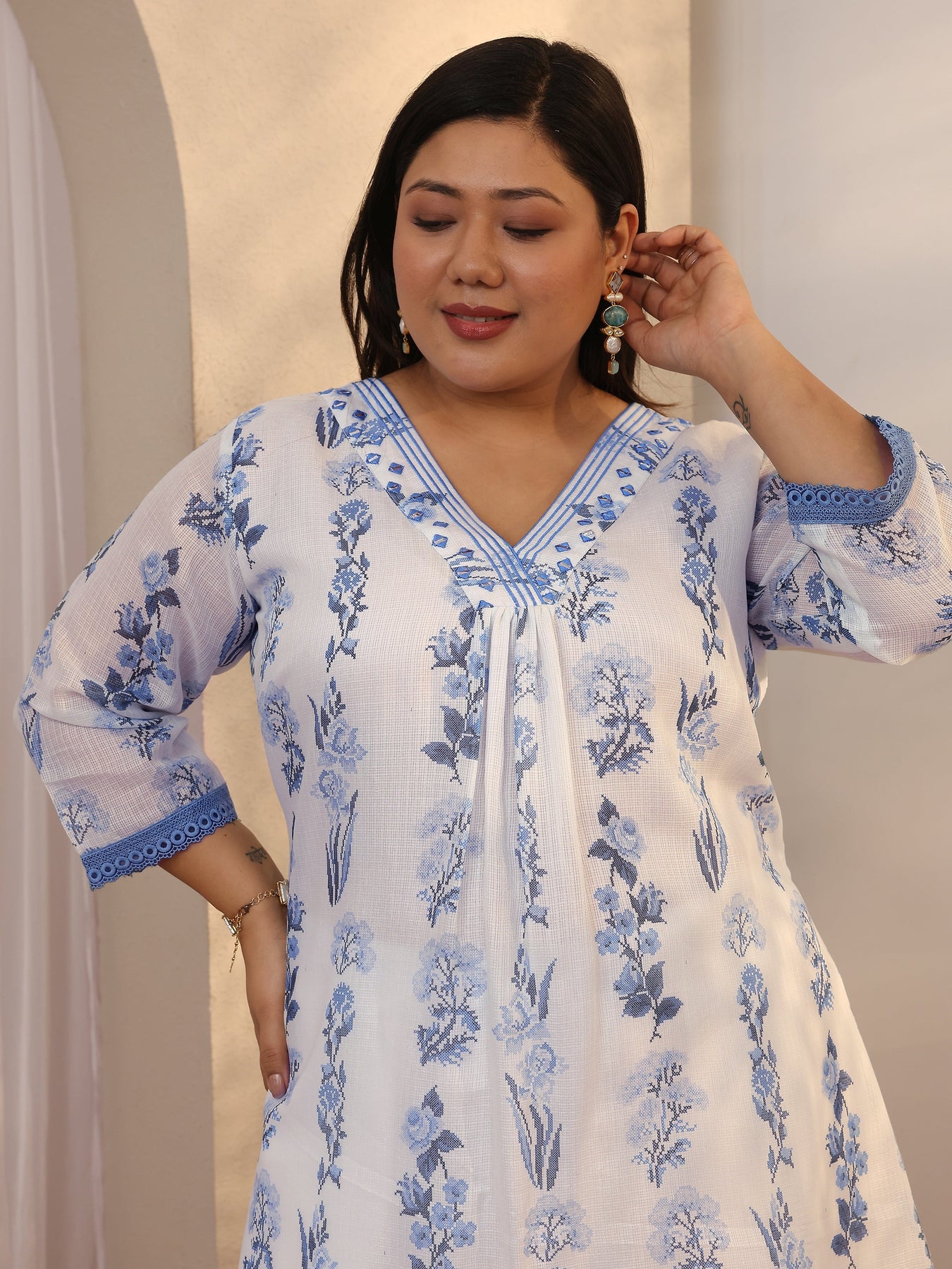Plus Size White Printed Kota Straight Suit Set With Dupatta