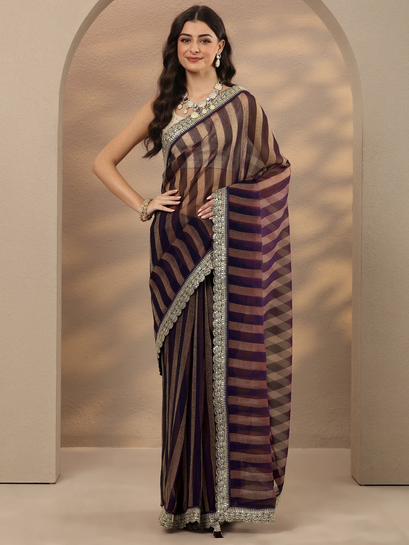 Purple Striped Embellished Silk Blend Saree With Unstitched Blouse Piece