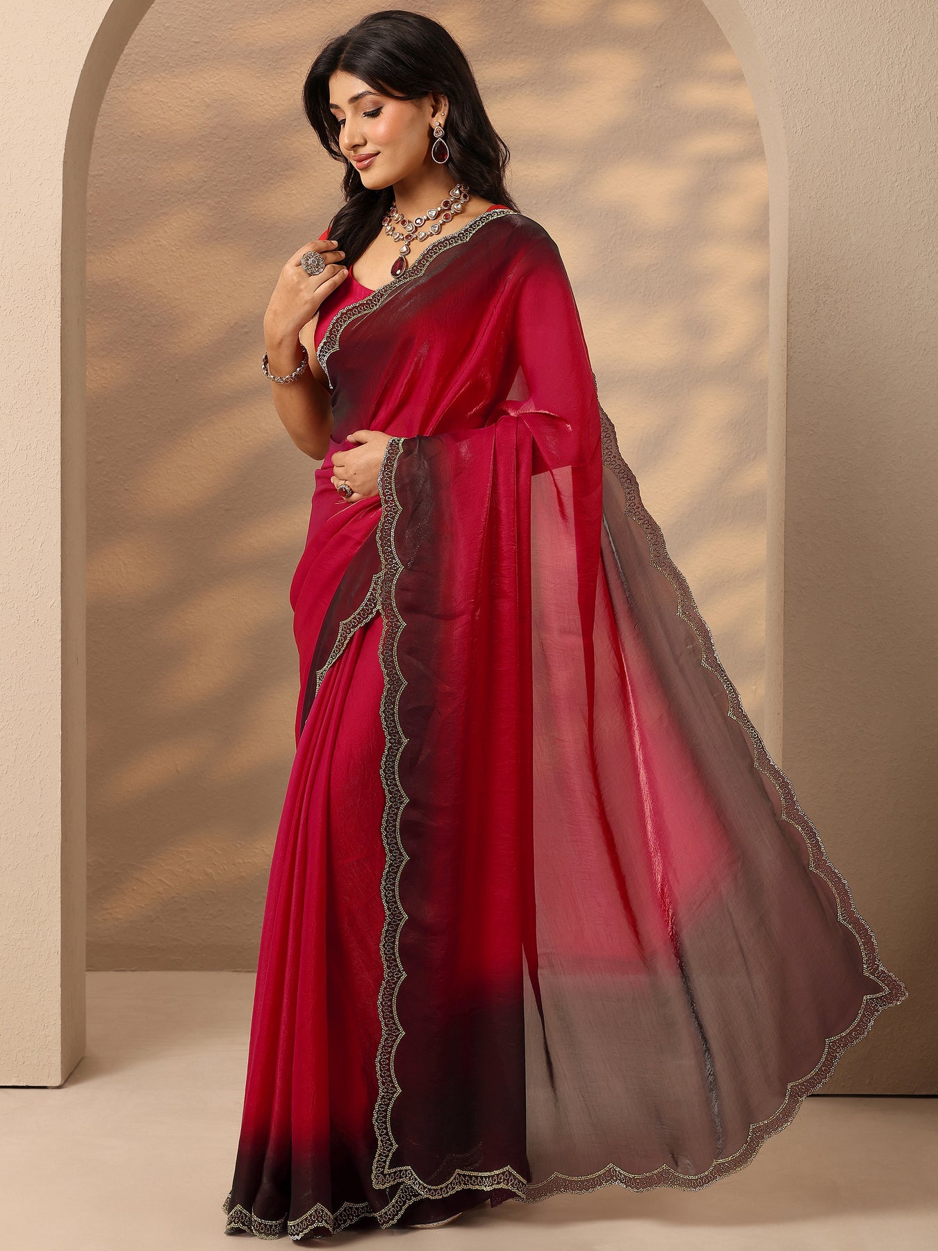 Our Red Solid Sarees Silk Blend Saree Features Captivating Solid. Complemented With An Unstitched Blouse Piece. This Charming Saree Is Perfect For Festive Occasions.