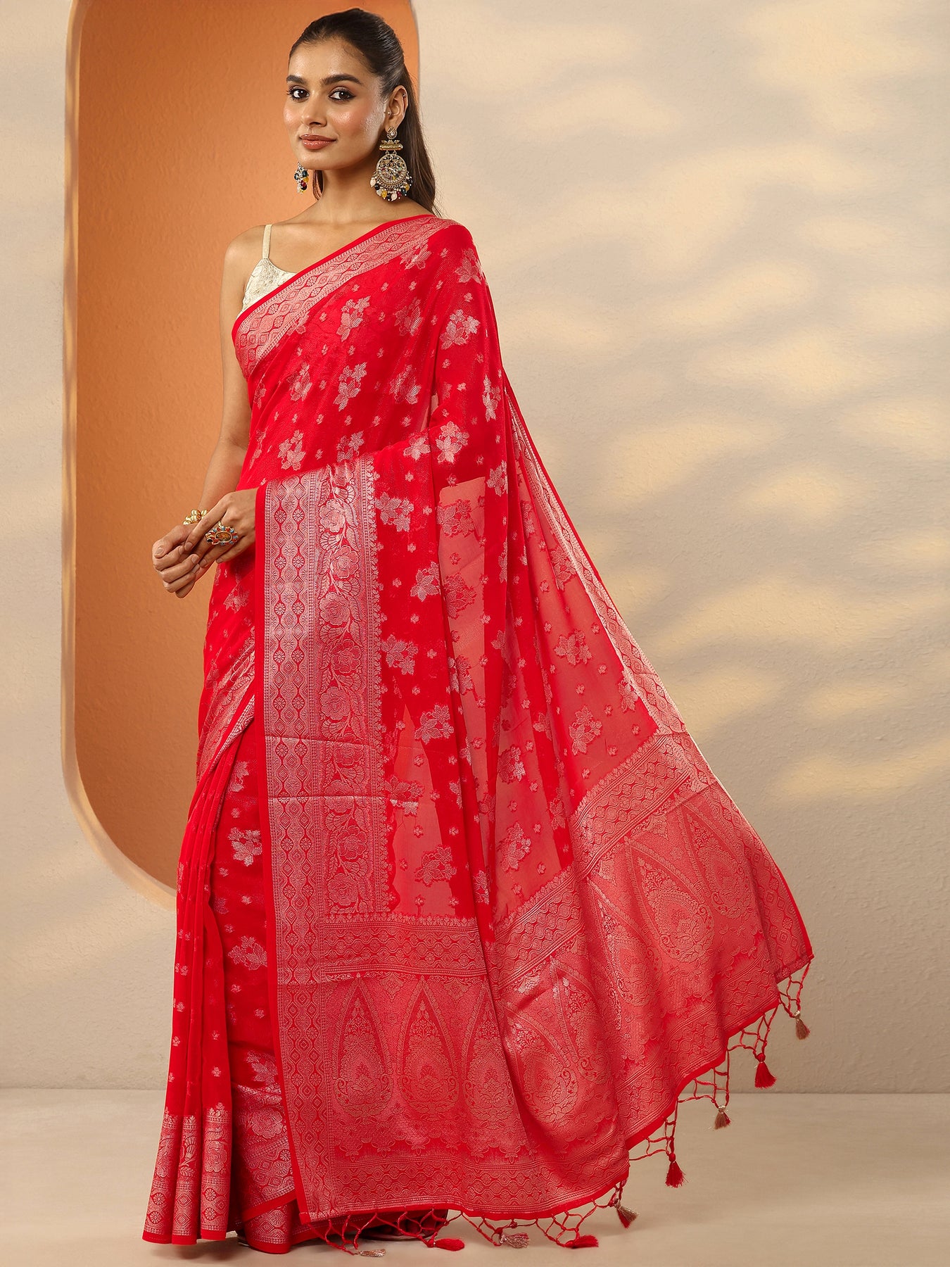 Red Woven Design Pure Georgette Saree With Unstitched Blouse Piece