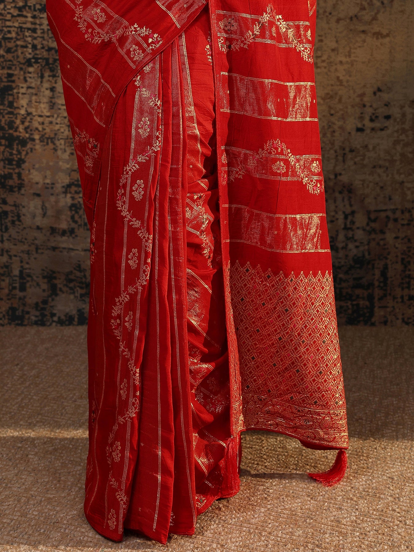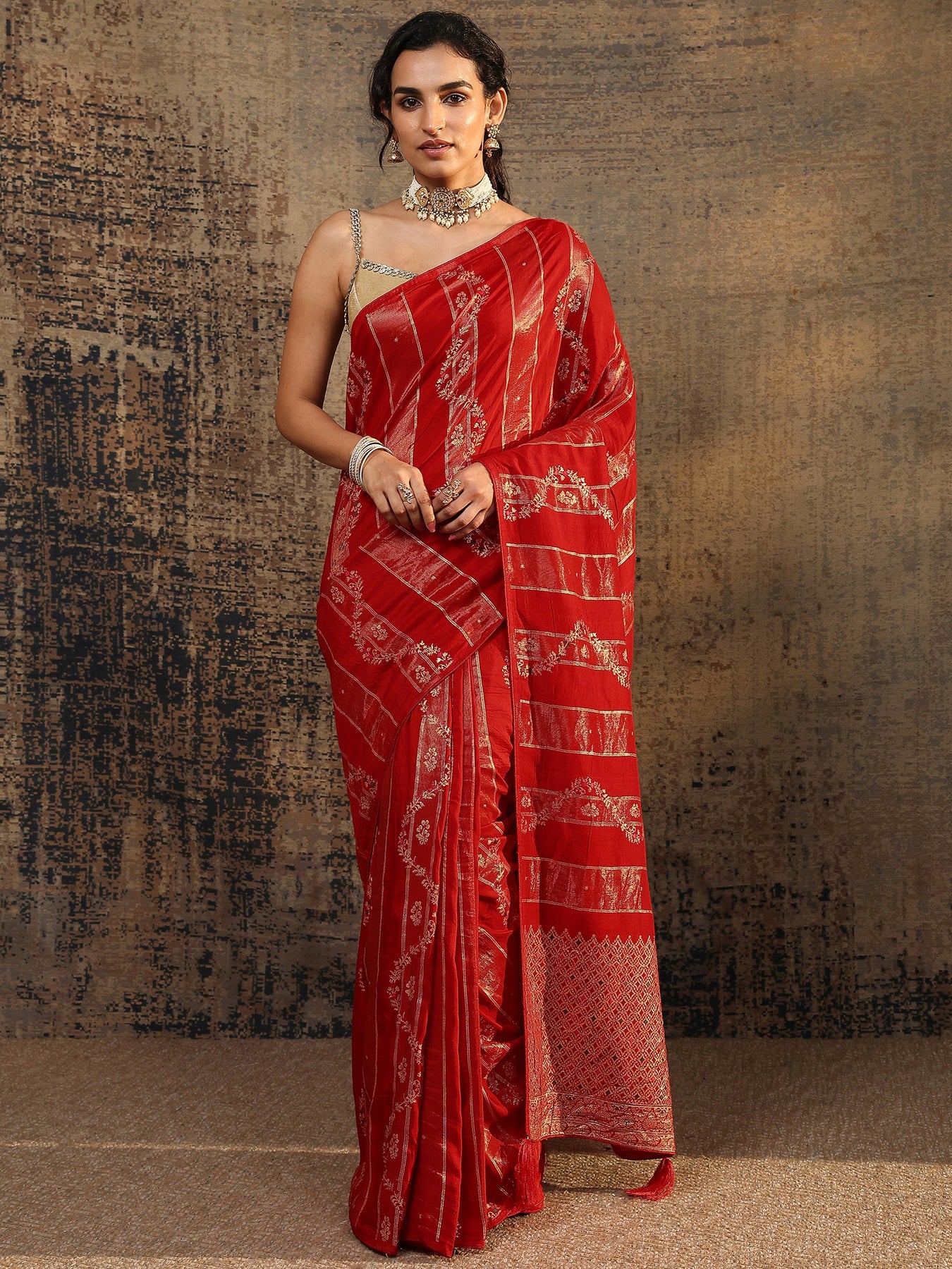 Our Red printed Silk blend saree features captivating Embellishments print. Complemented with an unstitched Blouse Piece. This charming saree is perfect for festive occasions