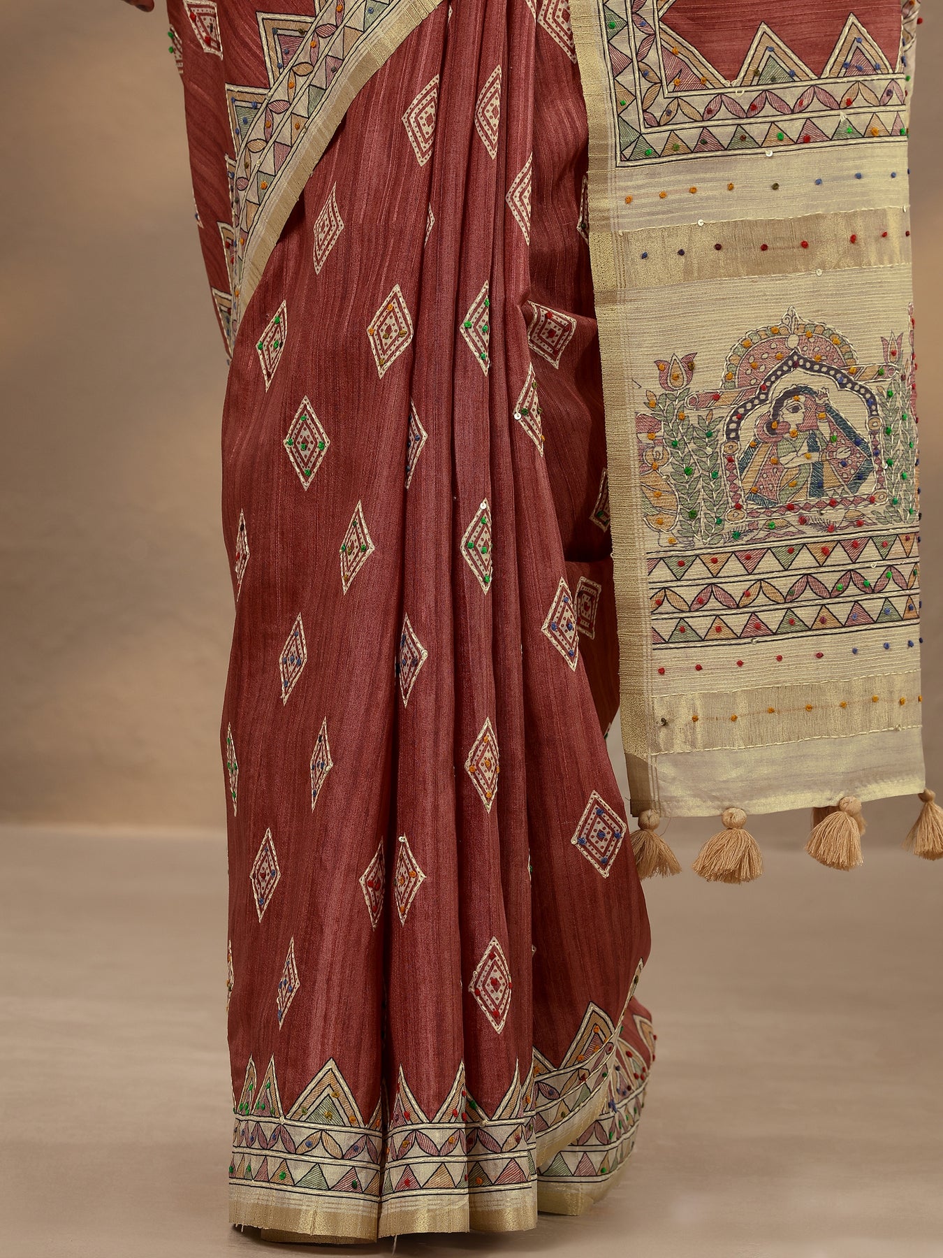 Our Rust Printed Silk Blend Saree Features Captivating Ethnic Motif. Complemented With An Unstitched Blouse Piece. This Charming Saree Is Perfect For Festive Occasions.