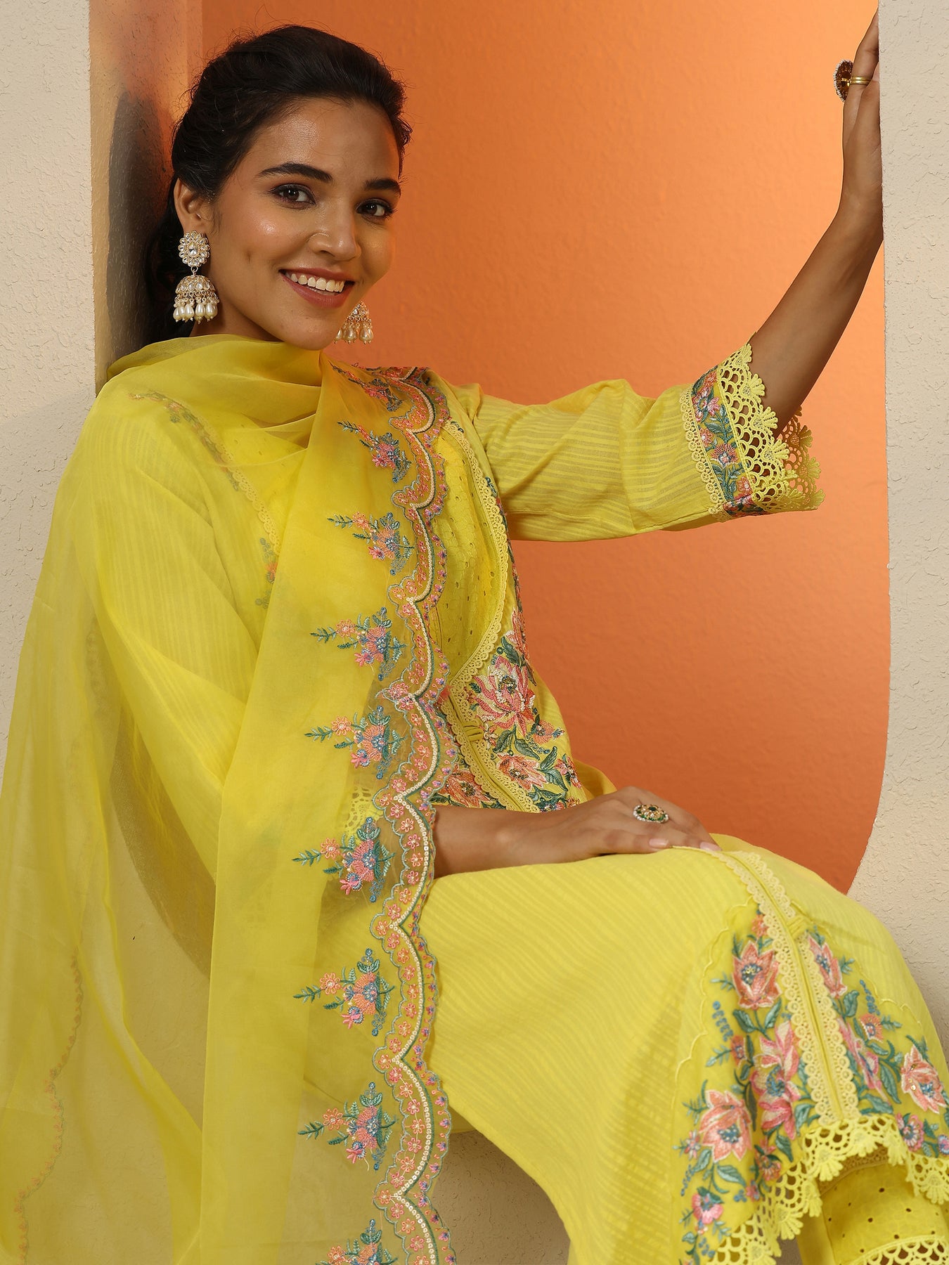 Yellow Embroidered Cotton Straight Suit Set With Dupatta